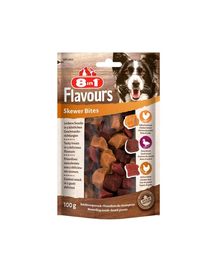 8IN1 Flavours Skewer Bites 100 g är ett utsökt hundgodis i bitform med kycklingbröst, ankbröst och fjäderfälever. De kan ges som belöning till vårt husdjur.