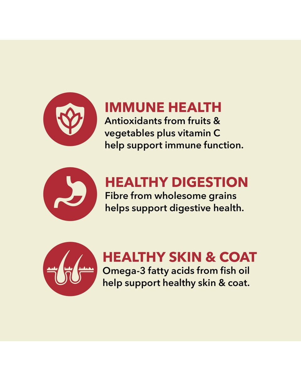Rått nötkött (16%), torkat lamm (15%), pärlkorn, hela ärtor, skalfri havre, fläskfett (8%), torkat fläskkött (8%), hel havre, kikärtsfiber, rått fläskkött (2%), fiskolja (1%), kaliumklorid, torkad tång, salt, torkad cikoriarot, färsk hel pumpa, färsk hel myskpumpa, färska hela morötter, färska hela äpplen, färska hela päron, färska hela zucchini, färsk grönkål, färsk spenat, färska rödbetsblad, färska rödbetsblad, hela tranbär, hela blåbär, hela saskatoonbär, gurkmeja, mjölktistel, kardborrerot, lavendel, valerianarot, nypon