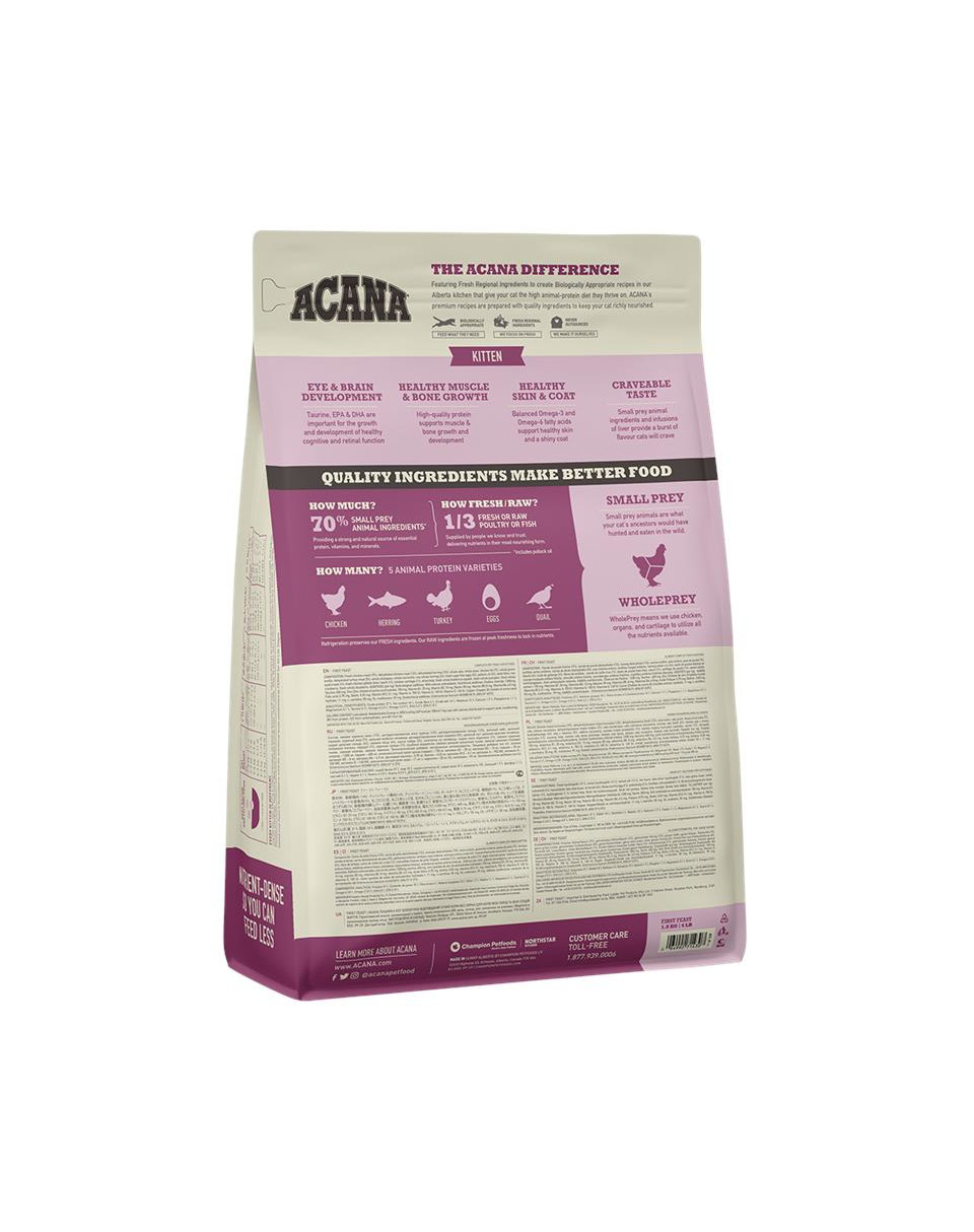 Det här läckra fodret från Acana ger din kattunge den perfekta start den förtjänar. Menyn innehåller färsk frigående kyckling och sill. Kattungefodret bidrar till utvecklingen av en frisk hud och päls. Kattfodret stöder också benutvecklingen och hjälper till med hjärnans utveckling.