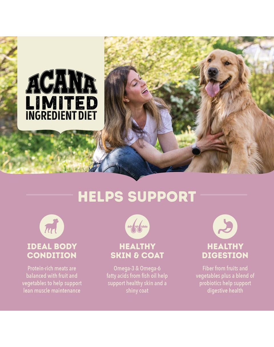 Acana Singles Grass Fed Lamb hundfoder är ett varierat helfoder som passar hundar i alla åldrar och av alla raser. Torrfodret innehåller färskt lammkött. Det består av 50% lamm från rancher i Nya Zeeland, som till och med är lämpligt för mänsklig konsumtion. Genom att använda helt lamm innehåller fodret i Nature många viktiga vitaminer och mineraler utan behov av tillsatser. Kolhydratinnehållet är reducerat för att förebygga fetma. Istället tillsätts ris, tapioka och potatis för att hålla blodsockernivån låg. Acana Singles Grass Fed Lamb hundfoder innehåller också olika växtbaserade ingredienser som hela gröna ärtor, gula ärtor, röda och gröna linser och sjögräs.