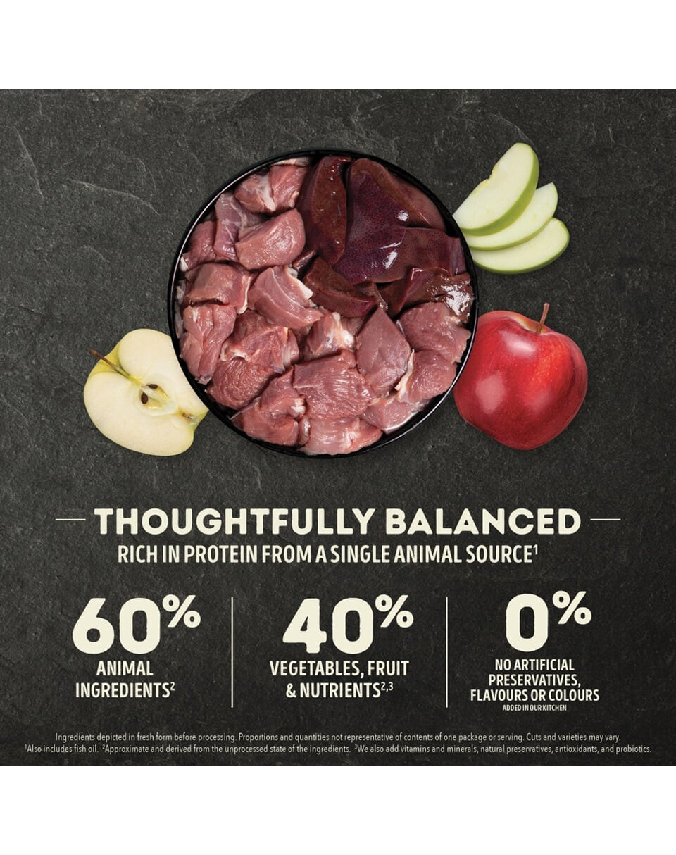 Rått lamm (21%), dehydratiserat lamm (19%), hela gröna ärtor, hela röda linser, rå lammlever (8%), rapsolja, färskt äpple (4%), hela kikärter, hela gröna linser, hela gula ärtor, linsfiber, ärtstärkelse, solrosolja, sjögräs (källa till EPA och DHA), råa lammtripe (1%), råa lammnjurar (1%), färsk hel pumpa, färsk hel pumpa, torkad tång, salt, torkad gurkrot, hela blåbär, hela blåbär, gurkmeja, mjölktistel, kardborrerot, lavendel, valerianarot, nypon.