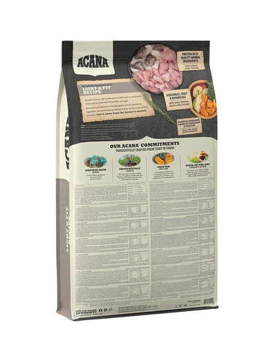 Acana Heritage Light & Fit är rikt på högkvalitativt kött från frigående kycklingar (55%) och hela ägg från regionala fjäderfägårdar samt nyfångad flundra från Vancouver Island, som levereras färsk, ofryst och konserveringsfri varje dag. Med sitt höga proteininnehåll är Acana ett naturligt foder, fritt från vete, ris, majs och gluten - ingredienser som ofta orsakar matsmältningsproblem. Istället innehåller torrfodret färsk frukt och grönsaker.