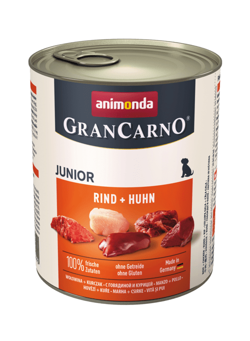 GranCarno Junior står för balanserad, välsmakande och hälsosam näring på högsta nivå för växande hundar under deras första levnadsår. De utvalda, färska köttiga ingredienserna garanterar den makalösa smak som hundar älskar så mycket. GranCarno Junior - med de valpvänliga, små köttbitarna är speciellt anpassad till näringsbehoven hos växande, unga hundar.