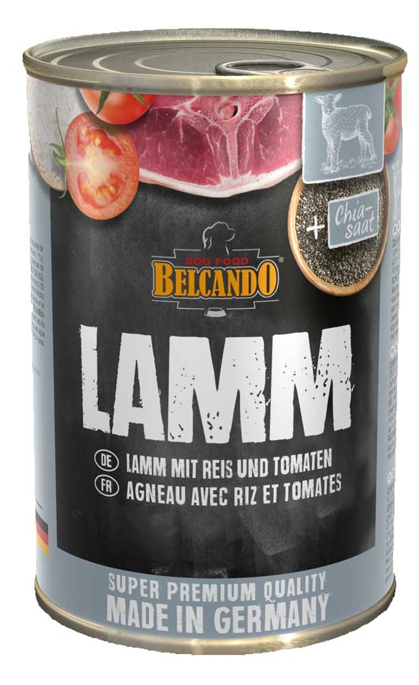 Lammkött, våm, lever, hjärta, lunga (63 %); lammköttsbuljong (26,5 %); ris, kokt (4 %); tomater (4 %); chiafrön (1 %); äggskal, torkade (0,5 %); mineraler (0,5 %); safflorolja (0,5 %)