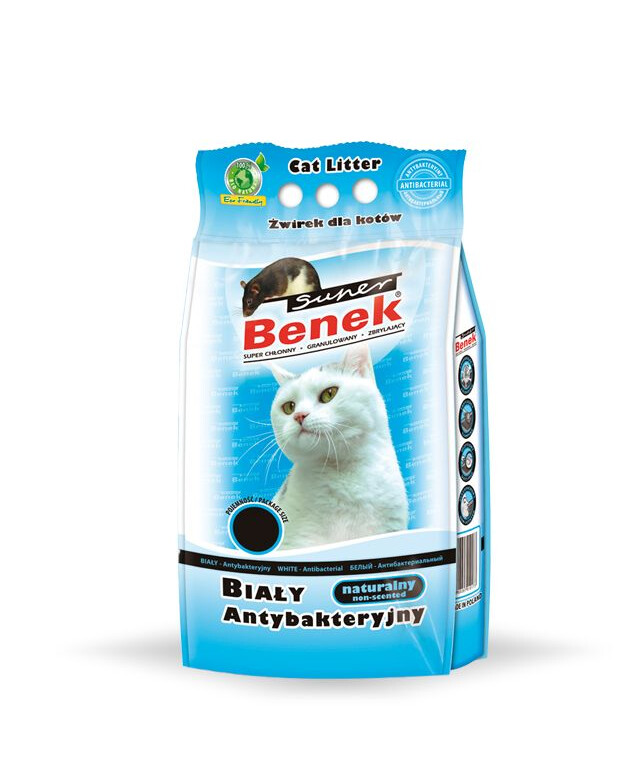 Super Benek White absorberar fukt och lukt och hämmar bakterietillväxten. De vita, enhetliga kornen ger ett estetiskt tilltalande utseende och förhindrar att ströet fastnar i djurets päls, vilket avsevärt minskar läckaget från kattlådan. Begagnat strö klumpar ihop sig och missfärgas och är lätt att skilja från färskt strö.