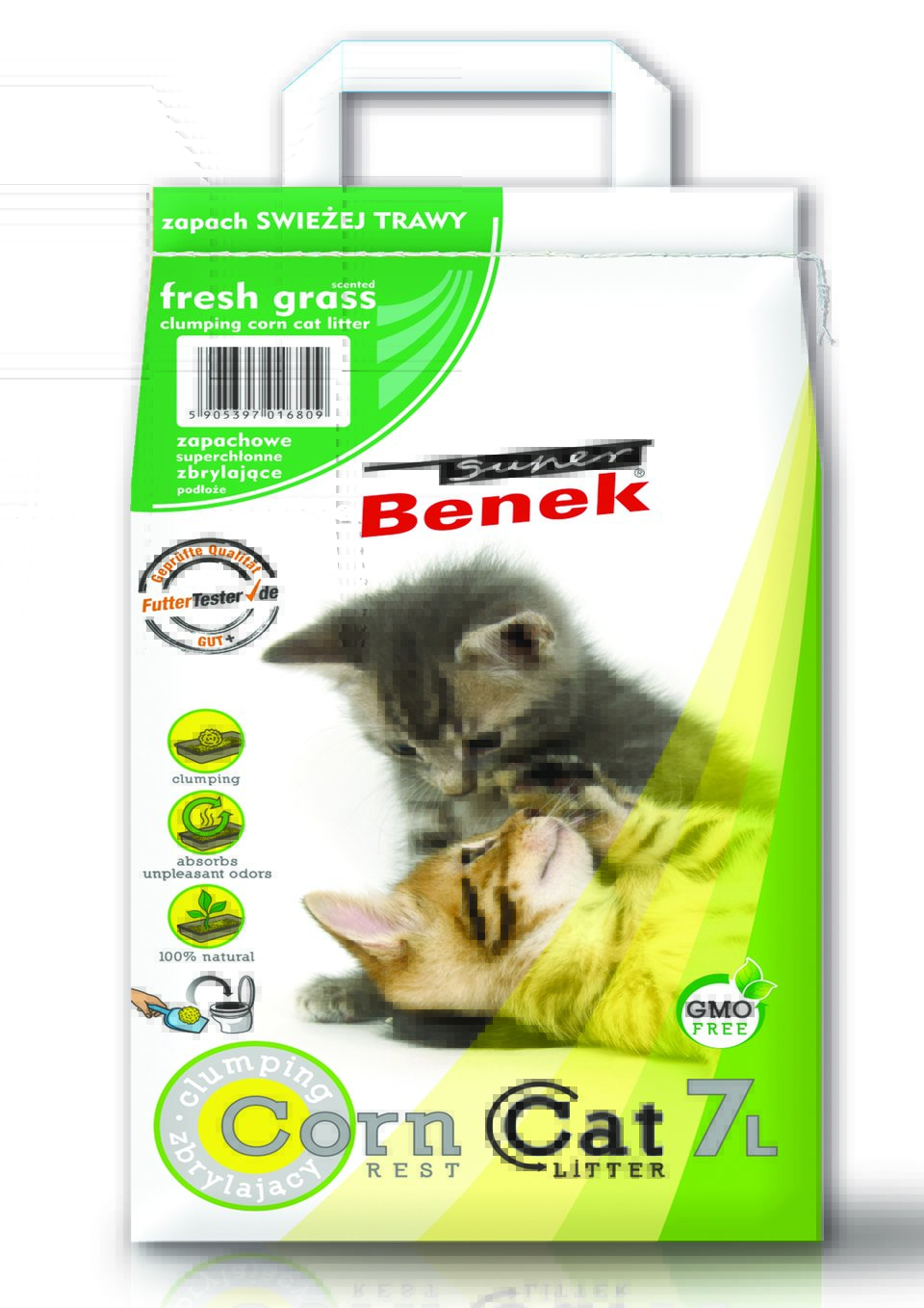 Benek CORN-sand är en ny generation av produkter som tillverkas av naturligt växtmaterial och utan kemiska tillsatser. Den är mycket effektiv (idealisk för ägare till flera katter) och "flyter" inte utanför kattlådan. Den absorberar också lukter mycket effektivt, klumpar ihop sig och är lätt att göra sig av med. Den kan kastas i toaletten och är biologiskt nedbrytbar (inklusive förpackningen). Substraten i Super Benek CORN-serien är säkra för katten om den sväljer dem.