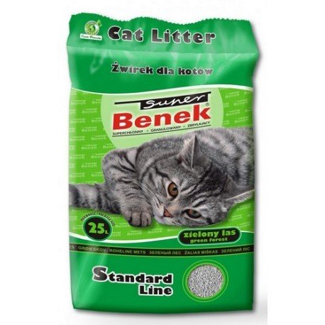 Super Benek Green Forest strö med en ny uppfriskande talldoft som är behaglig för människor och accepteras av djur. Denna strö är särskilt rekommenderad för stamtavla och huskatter. Doften har en lätt stimulerande effekt. Rekommenderas för äldre eller orörliga djur för att aktivera dem och uppmuntra dem att röra på sig.