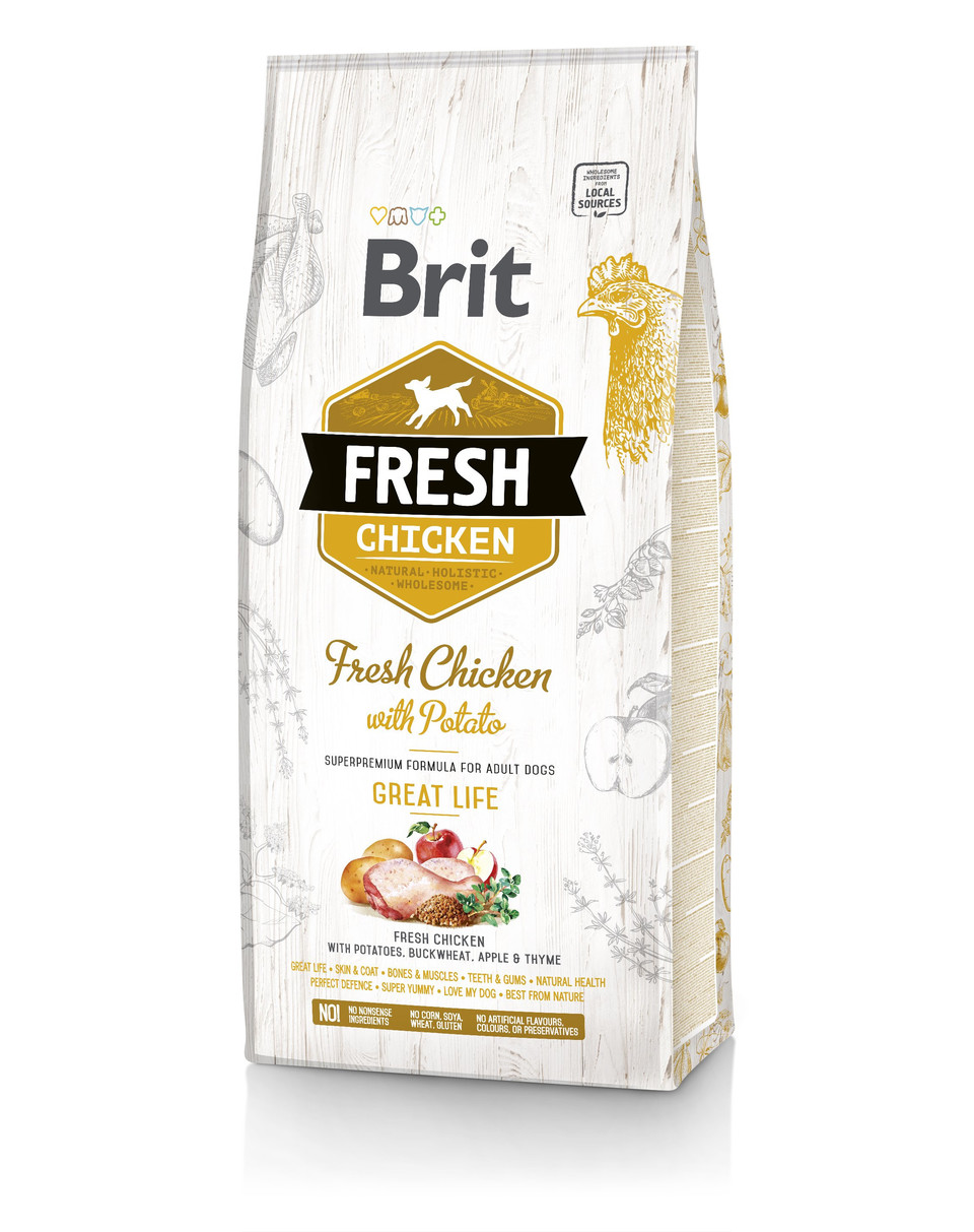 Färsk kyckling med potatis, bovete, äpplen och timjan. Premium för vuxna hundar. Komplett mat för hundar.