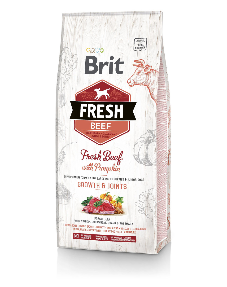 Färskt nötkött med pumpa, bovete, mangold och rosmarin. Premium för valpar och unga hundar av stor ras. Komplett foder för hundar.