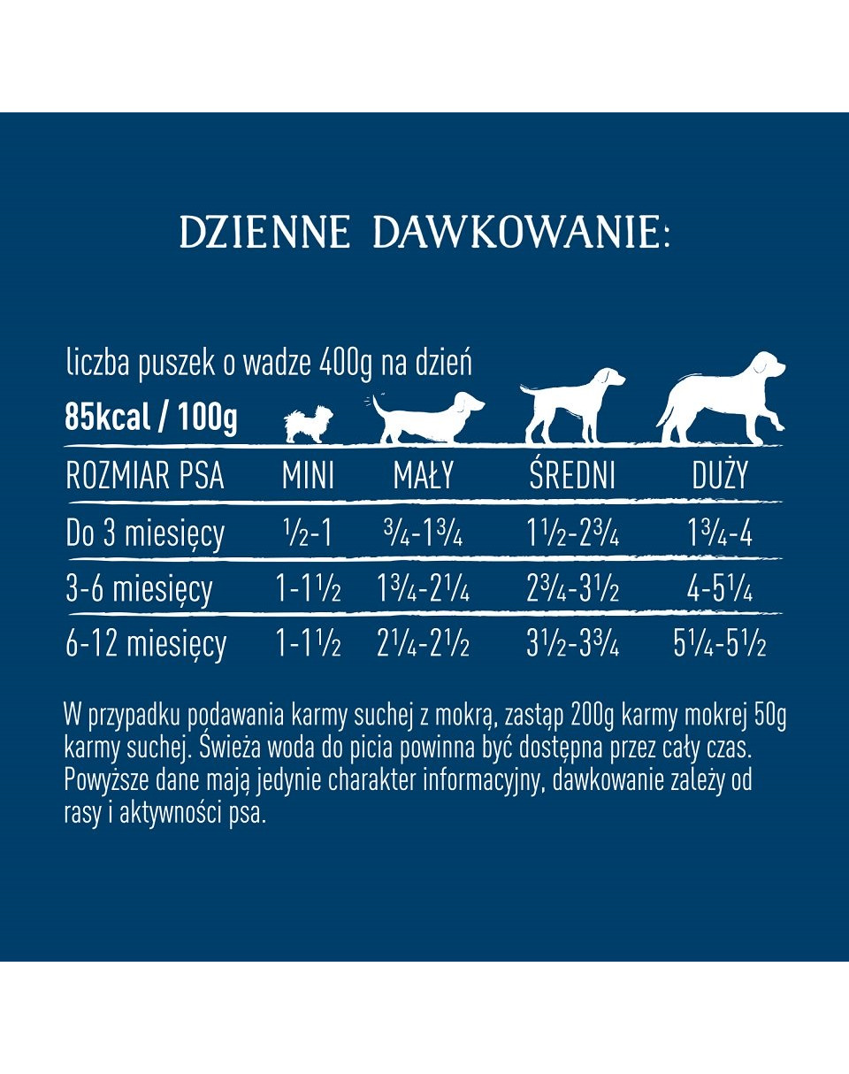 Ingredienser: Kyckling 40%, nötkött 10%, laxolja, persilja, nypon, cikoria, mynta, mineraler, prebiotika (mannanoligosackarider 0,2%), dokosahexaensyra (DHA 0,07%). *Naturligtvis tillsätter vi inte aska i din hunds mat - det är bara en teknisk term för mineralinnehållet i maten. DagligDOSERING (antal 400g burkar per dag) Om du utfodrar torrfoder med våtfoder, byt ut 200 g våtfoder mot 50 g torrfoder. Färskt dricksvatten ska alltid finnas tillgängligt. Siffrorna på motstående sida är endast för information, doseringen beror på ras och aktivitetsnivå.
