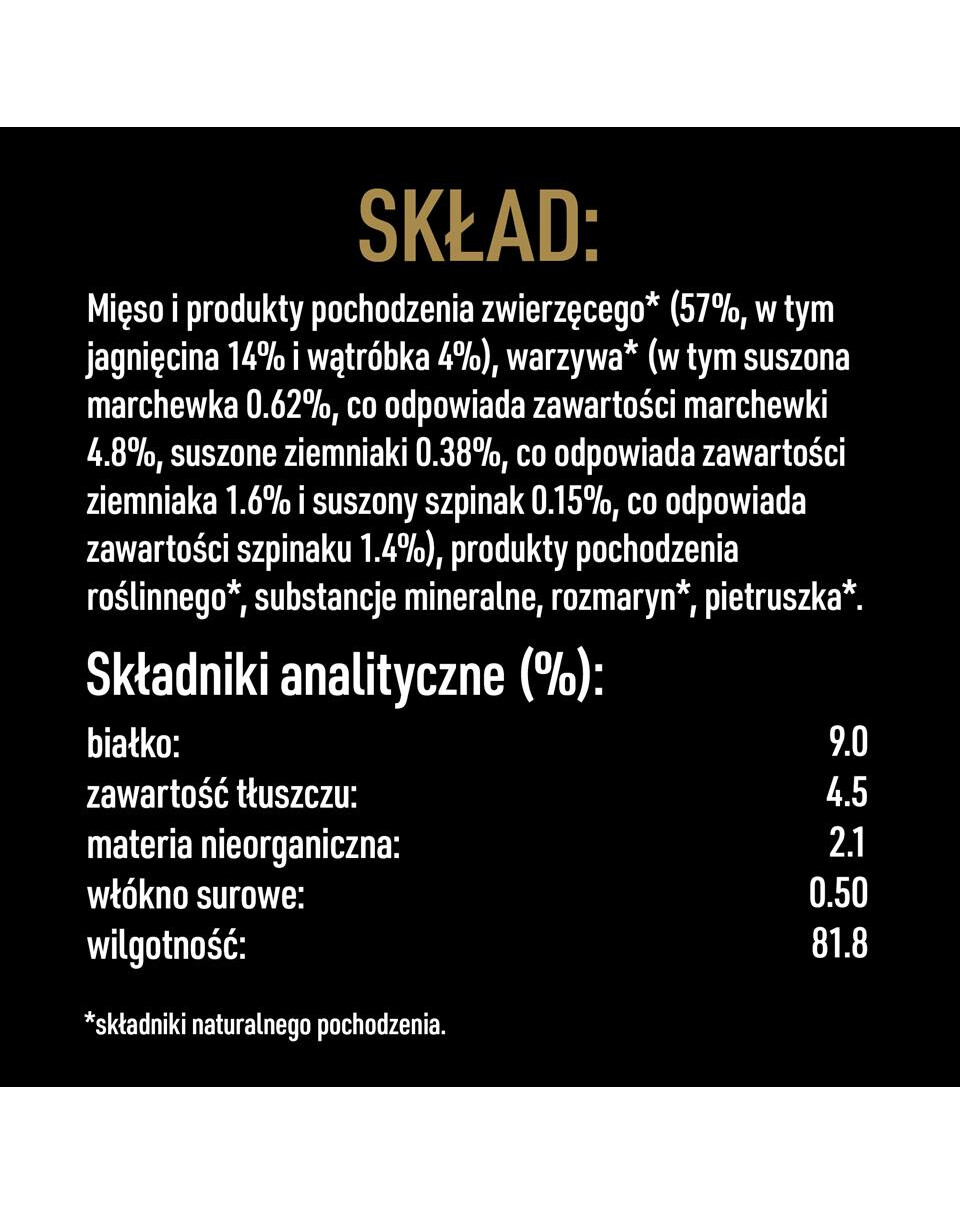 Kött och produkter av animaliskt ursprung* (57%, varav lamm 14% och lever 4%), grönsaker* (varav torkade morötter 0,62%, motsvarande en morotshalt på 4,8%, torkad potatis 0,38%, motsvarande en potatishalt på 1,6% och torkad spenat 0,15%, motsvarande en spenatinnehåll på 1,4%), produkter av vegetabiliskt ursprung*, mineraler, rosmarin*, persilja*.