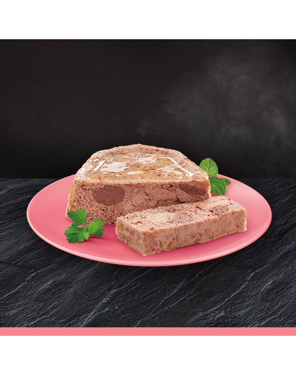 Ingredienser: kött och animaliska biprodukter (55%, naturligt ursprung* 95%, varav kalvkött 4%, varav kycklinglever 4%), spannmål, mineralämnen, växtbaserade produkter, växtbaserade proteinextrakt. *Ingredienser av naturligt ursprung.