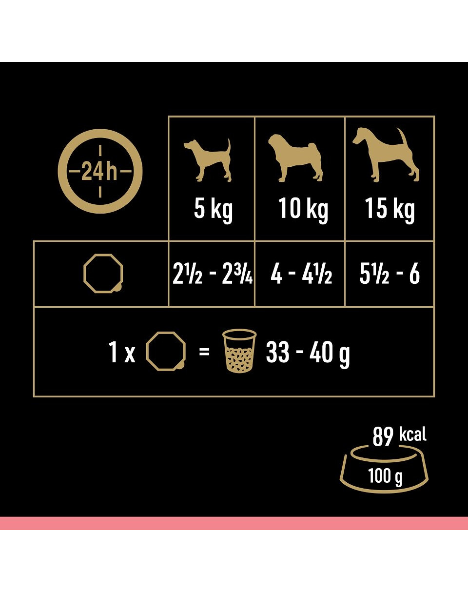 En hund som väger 5 kg behöver 2½ - 2¾ skålar per dag, en hund som väger 10 kg behöver 4 - 4½ skålar per dag, en hund som väger 15 kg behöver 5½ - 6 skålar per dag. 1 skål kan ersättas med 33 - 40 g torrfoder.