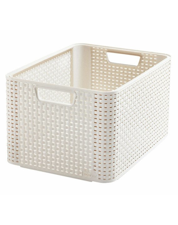 Tillverkad av högkvalitativ plast med en rottingstruktur.