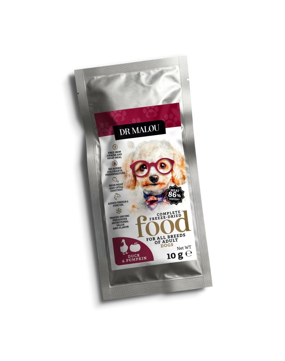 Liofiliserad komplett mat Dr Malou Anka med Pumpa är ett alternativ till standardfoder, avsett för ägare som vill erbjuda sin hund en naturlig kost, utan spannmål, konstgjorda tillsatser och färgämnen. Tack vare den innovativa liofiliseringstekniken behåller maten hela spektrumet av näringsvärden och den unika, naturliga smaken av färska ingredienser.