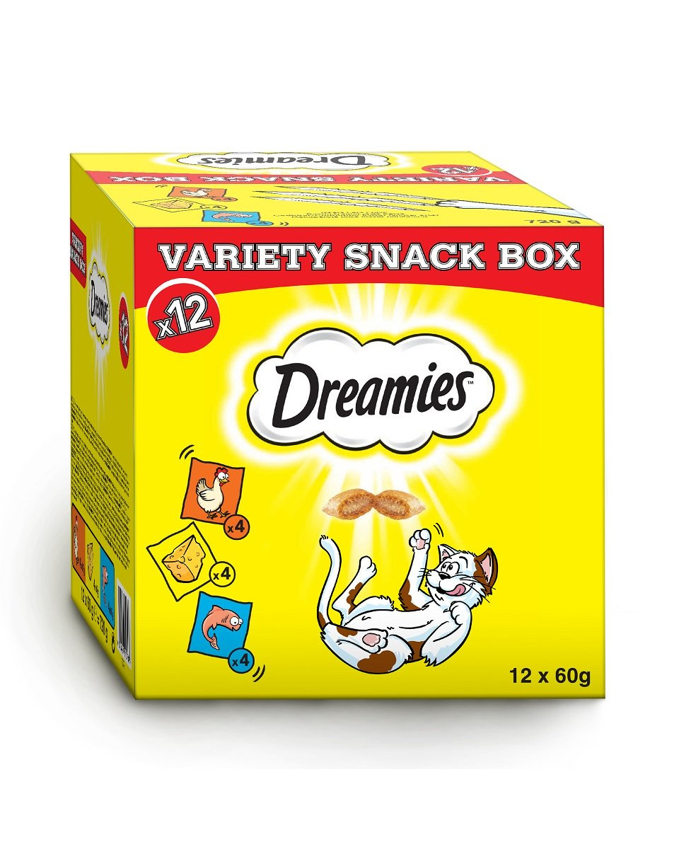 • Leveransomfattning: 12 x 60g Dreamies i praktisk Variety Snack Box bulkförpackning / Kattmat med fjäderfä, fisk och ost / Endast 2 kcal per bit / Krispigt mellanmål för utomhus- och inomhuskatter