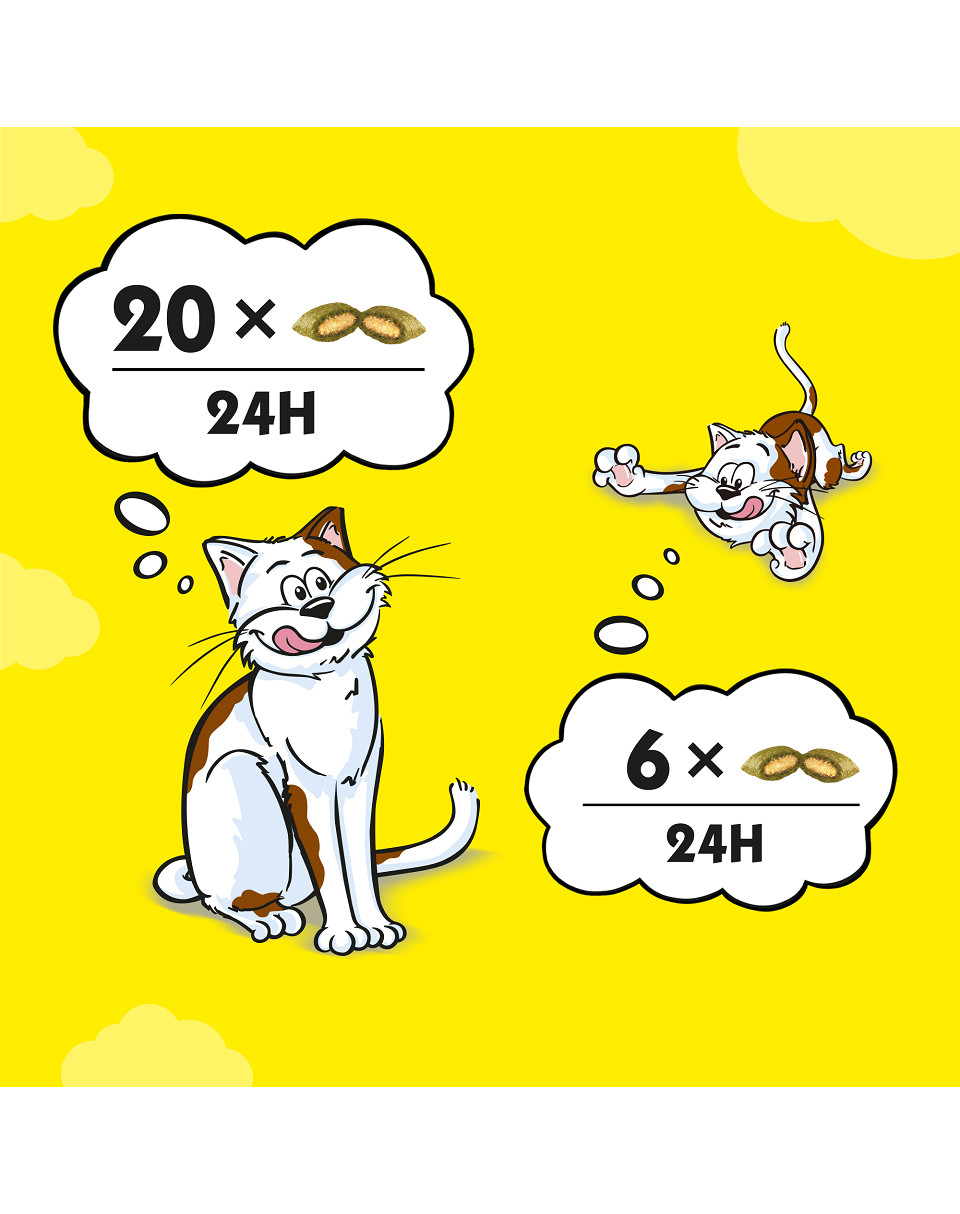 • Sötsugna katter kan äta upp till 20 bitar (unga katter max. 6 bitar) av snacksen per dag / En extra skål med dricksvatten bör alltid finnas tillgänglig & hela dieten bör minskas i enlighet med detta