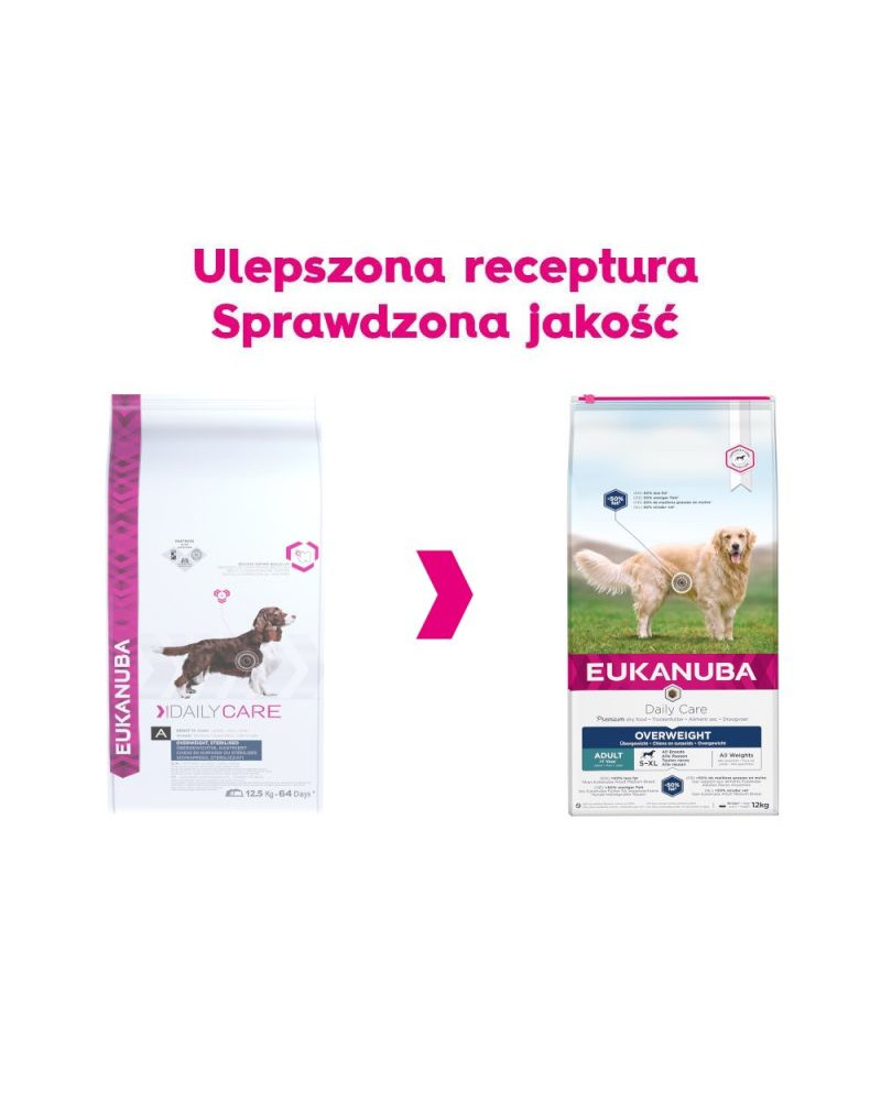 EUKANUBA Daily Care Overweight för överviktiga och poststeriliserade hundar för att stödja viktminskning och bibehålla en smal figur.