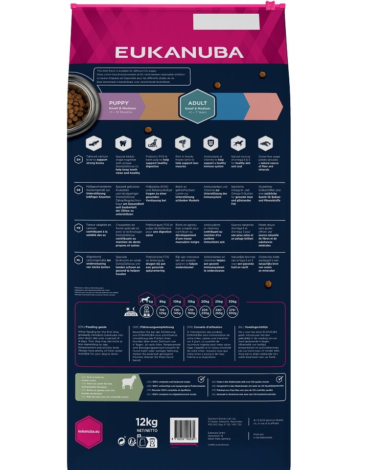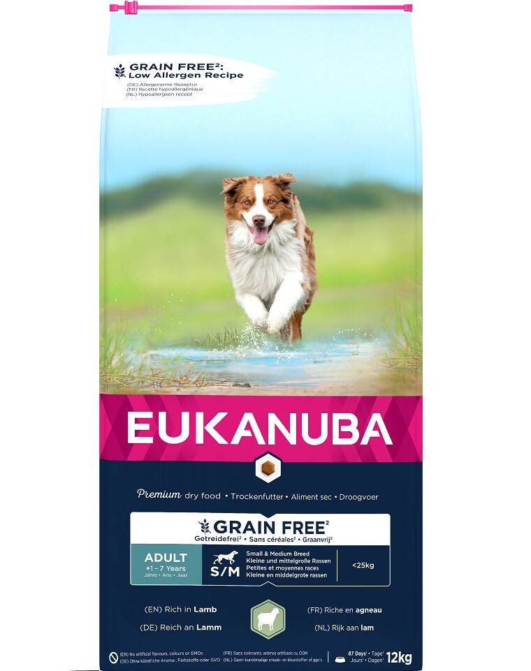 EUKANUBA Grain Free torrfoder med färskt, fryst lammkött för vuxna hundar av små och medelstora raser bidrar till att bibehålla magra muskler. Receptet innehåller antioxidanter och vitaminer för ett välfungerande immunsystem och glutenfri sötpotatis som en naturlig källa till fibrer och mineraler. För att ytterligare stödja en god matsmältning har betmassa och FOS-prebiotika tillsatts i fodret, liksom tillräckligt med kalcium för att stödja benhälsan. Dessutom har innehållet av naturliga källor till omega-6- och omega-3-fettsyror en positiv effekt på hudens hälsa och en glänsande päls. Den speciella pelletsformen och det unika DentaDefense-systemet bidrar till att hålla tänderna friska och rena. EUKANUBA spannmålsfritt foder för vuxna små och medelstora hundar är 100 % komplett och balanserat och säkerställer din hunds välbefinnande.Fördelar: