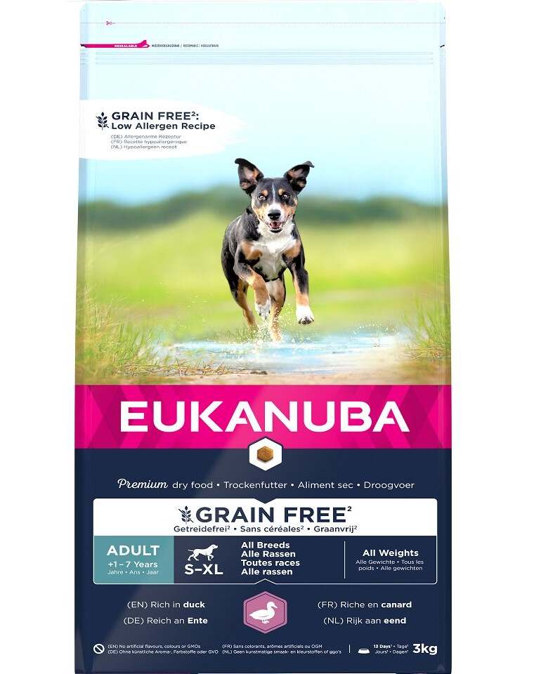 EUKANUBA Grain Free är ett foder för vuxna hundar av alla raser som är rikt på färsk fryst anka för att bibehålla magra muskler. Receptet innehåller antioxidanter och vitaminer för god immunförsvarsfunktion och glutenfri sötpotatis som en naturlig källa till fibrer och mineraler. För att ytterligare stödja matsmältningen har betmassa och FOS-prebiotika tillsatts i fodret, liksom tillräckligt med kalcium för att stödja benhälsan. Innehållet av naturliga källor till omega-6- och omega-3-fettsyror har i sin tur en positiv effekt på hudens hälsa och en glänsande päls. Den speciella pelletsformen och det unika DentaDefense-systemet bidrar till att hålla tänderna friska och rena. EUKANUBA Grain Free för vuxna hundar av alla raser är 100 % komplett och balanserat och säkerställer din hunds välbefinnande.Fördelar: