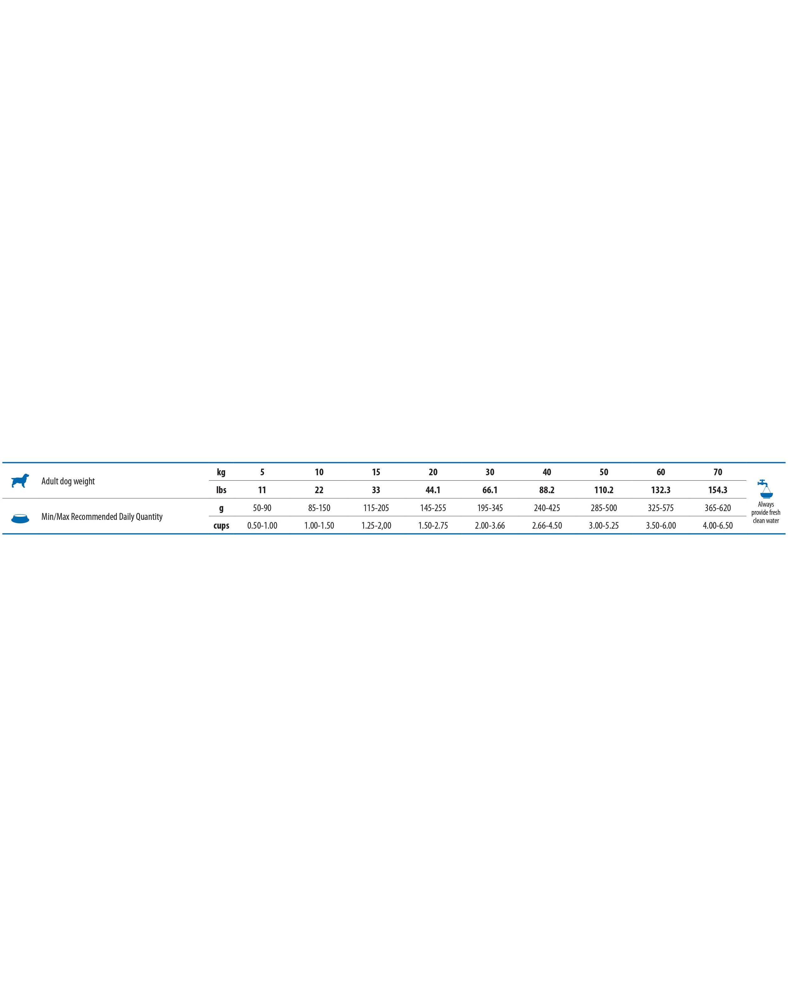 Råprotein 28,00%; råfett 8,00%; råfiber 8,20%; fukt 9,00%; råaska 7,90%; kalcium 0,90%; fosfor 0,80%; natrium 0,30%; kalium 0.65%; magnesium 0,12%; omega-6 fettsyror 1,20%; omega-3 fettsyror 0,25%; DHA 0,12%; EPA 0,10%; glukosamin 1200mg/kg; kondroitinsulfat 900mg/kg.