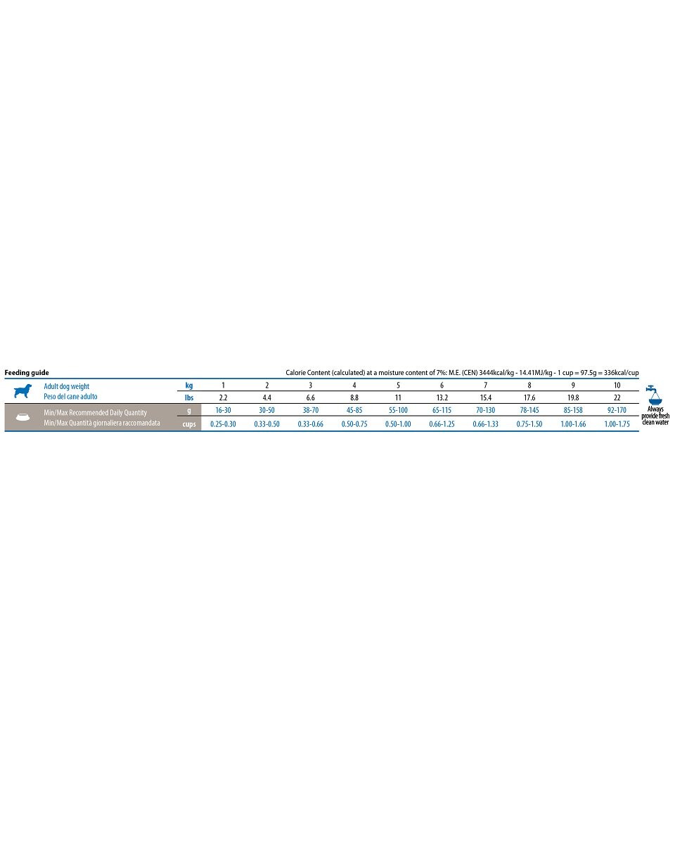 Användningsanvisning: Utfodras i rumstemperatur, doseras enligt bifogad tabell. Den dagliga mängden som anges i tabellen är endast en vägledning och måste justeras för att uppnå rätt kroppsvikt. Den dagliga dosen kan variera beroende på djurets ras, miljö, fysiska aktivitet, temperament och kondition. En portion kan delas upp på två eller flera måltider per dag. Inledningsvis rekommenderas att N&D-foderlinjen kombineras med det befintliga fodret. Se till att din hund har ständig tillgång till rent och friskt vatten.