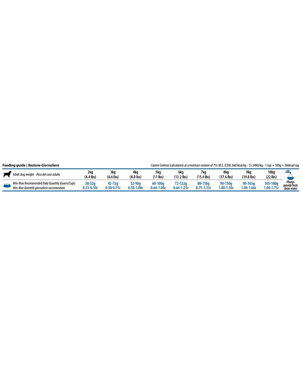 Råprotein 23,00 %; råfett 12,00 %; råfiber 2,80 %; råfuktighet 9,00 %; råaska 7,90 %; kalcium 1,10 %; fosfor 0,90 %; omega-3 fettsyror 0,40 %; omega-6 fettsyror 2,20 %; DHA 0,20 %; EPA 0,10 %; glukosamin 1200 mg/kg; kondroitinsulfat 900 mg/kg.