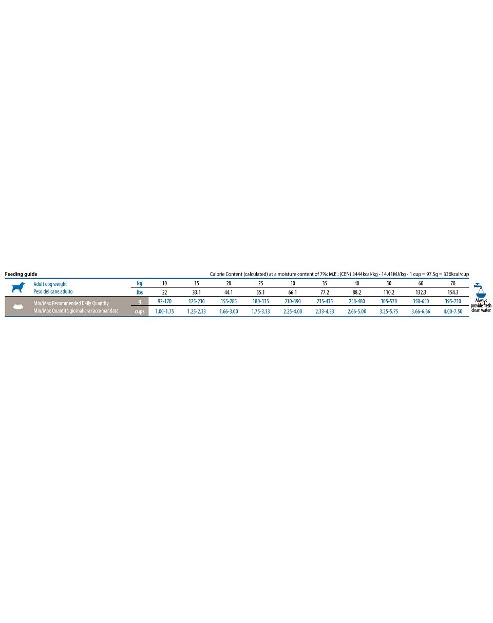 Råprotein 30,00 %; Råfett 11,00 %; Råfiber 5,70 %; Fukt 9,00 %; Råaska 7,80 %; Kalcium 1,20 %; Fosfor 0,90 %; Kalium 0,60 %; Natrium 0,35 %; Magnesium 0,10 %; Omega-6-fettsyror 2,00 %; Omega-3-fettsyror 0,30 %; DHA 0,10 %; EPA 0,05 %; Glukosamin 1200 mg/kg; Kondroitinsulfat 900 mg/kg.