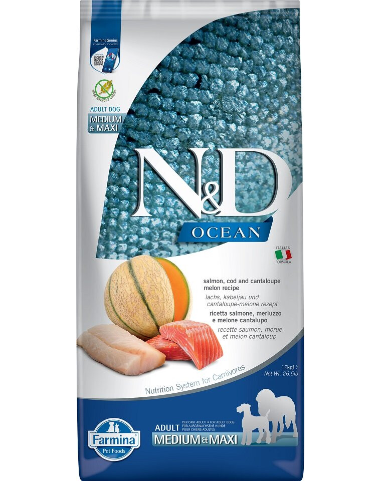 .Maten innehåller lax, torsk, pumpa och cantaloupemelon i sin sammansättning. Huvudingredienserna i fodret är lax och torsk, som är utmärkta källor till animaliskt protein. Fisk är en källa till fettsyror som har en antiinflammatorisk effekt, stärker huden och återfuktar pälsen. Fiskolja ger ett stort tillskott av omättade omega-3-fettsyror med antiinflammatoriska egenskaper. Blåbär kännetecknas av sin höga antioxidativa aktivitet och höga polyfenolhalt, vilket kompletterar kosten perfekt för hundar med ökad fysisk aktivitet. Den höga andelen frukt och grönsaker bidrar till ett högt innehåll av vitaminer, näringsämnen och fibrer, vilket skapar rätt förutsättningar för att utveckla och bibehålla hundens kondition. Fodrets recept och energivärde är lämpligt för hundar av medelstora och stora raser.