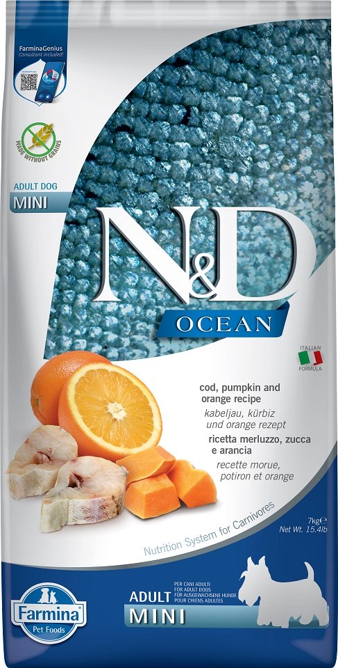 Färskt torskkött (25%), torkat torskkött (25%), ärtstärkelse, fiskolja (från sill), torkad pumpa (5%), ärtfiber, torkade morötter, torkad alfalfa, inulin, fruktooligosackarider, jästextrakt (källa till mannanoligosackarider), torkad söt apelsin (0.5%), torkat äpple, torkad granatäpplefrukt, torkad spenat, groblad (0,3%), torkade blåbär, natriumklorid, torkad bryggerijäst, gurkmejarot (0,2%), glukosamin, kondroitinsulfat