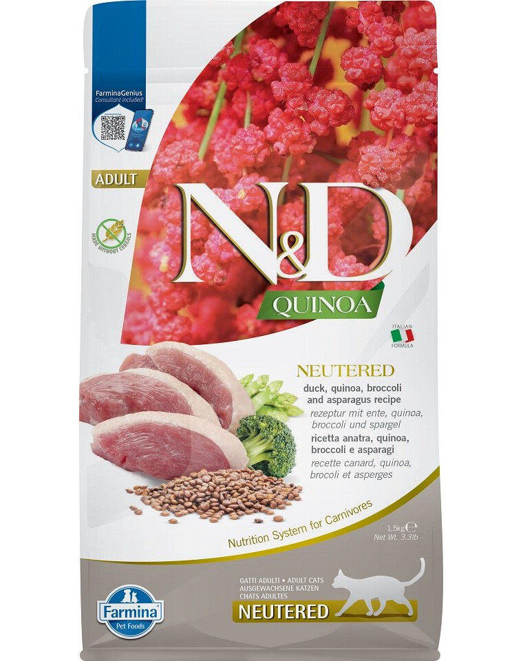 N&D Quinoa Neutered Duck är ett helfoder för vuxna katter efter kastrering.