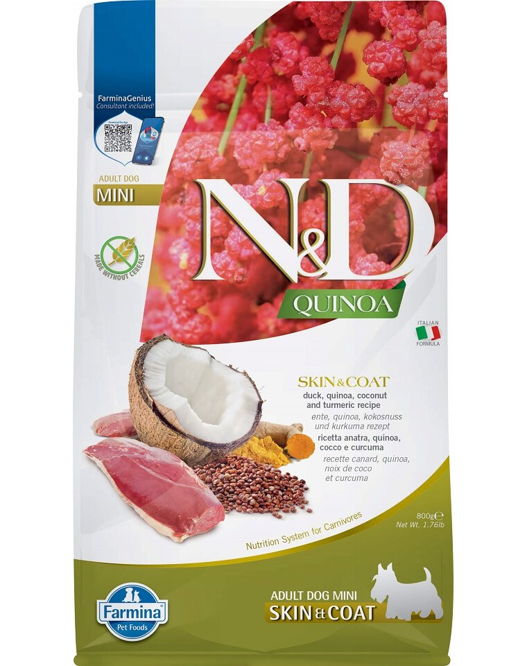 Dietiskt hundfoder rekommenderas för att minska intolerans mot ingredienser och näringsämnen. Fodret med anka, quinoa, kokosnöt och gurkmeja ger de näringsämnen, mineraler och vitaminer som behövs för att bibehålla en god kondition. Quinoa underlättar matsmältningen och upptaget av näringsämnen. Det är en källa till essentiella aminosyror, mineraler och antioxidanter och bidrar därmed till att förebygga hjärt- och kärlsjukdomar. Det är en glutenfri produkt med lågt glykemiskt index. Gurkmeja har en lugnande effekt på matsmältningssystemet och har antiinflammatoriska och antioxidativa egenskaper. Anka ger animaliskt protein och gör maten smakrik.
