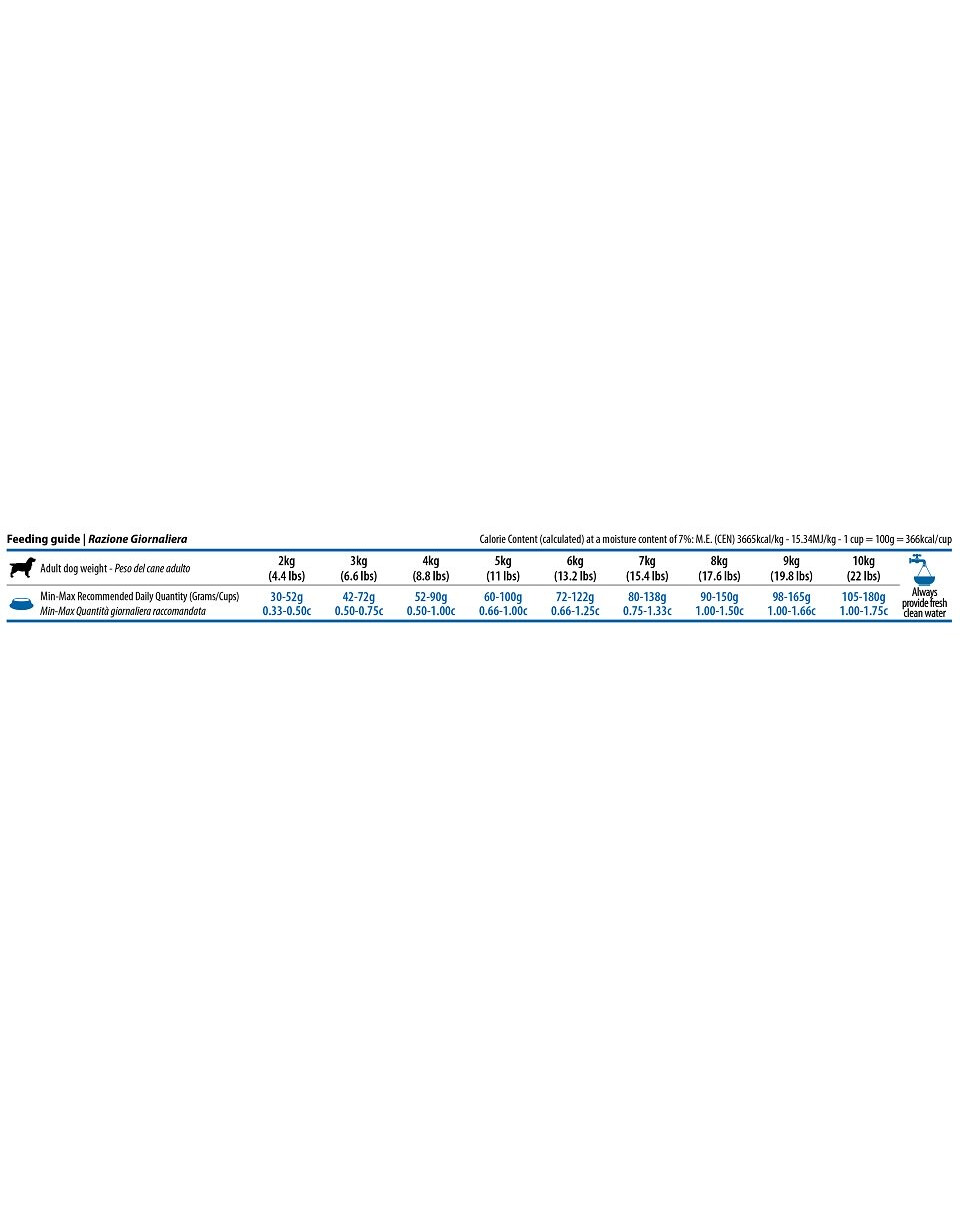 Råprotein 23,00 %; råfett 12,00 %; råfiber 2,80 %; fukt 9,00 %; råaska 7,90 %; kalcium 1,00 %; fosfor 0,80 %; omega-3-fettsyror 0,40 %; omega-6-fettsyror 2,20 %; DHA 0,20 %; EPA 0,10 %; glukosamin 1200 mg/kg; kondroitinsulfat 900 mg/kg.