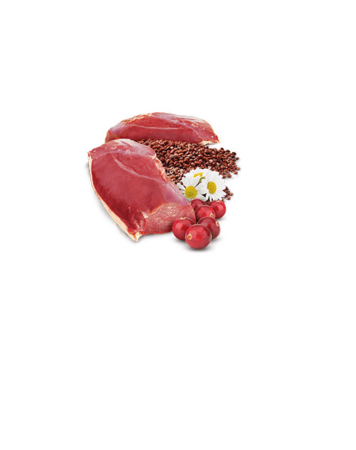 Anka (60 %), sill, kokta hönsägg, quinoafrön (5 %), fiskolja (från sill), tranbär, kamomill, fruktooligosackarider, kolinklorid, kondroitinsulfat, glukosamin, vitaminer, mineraler