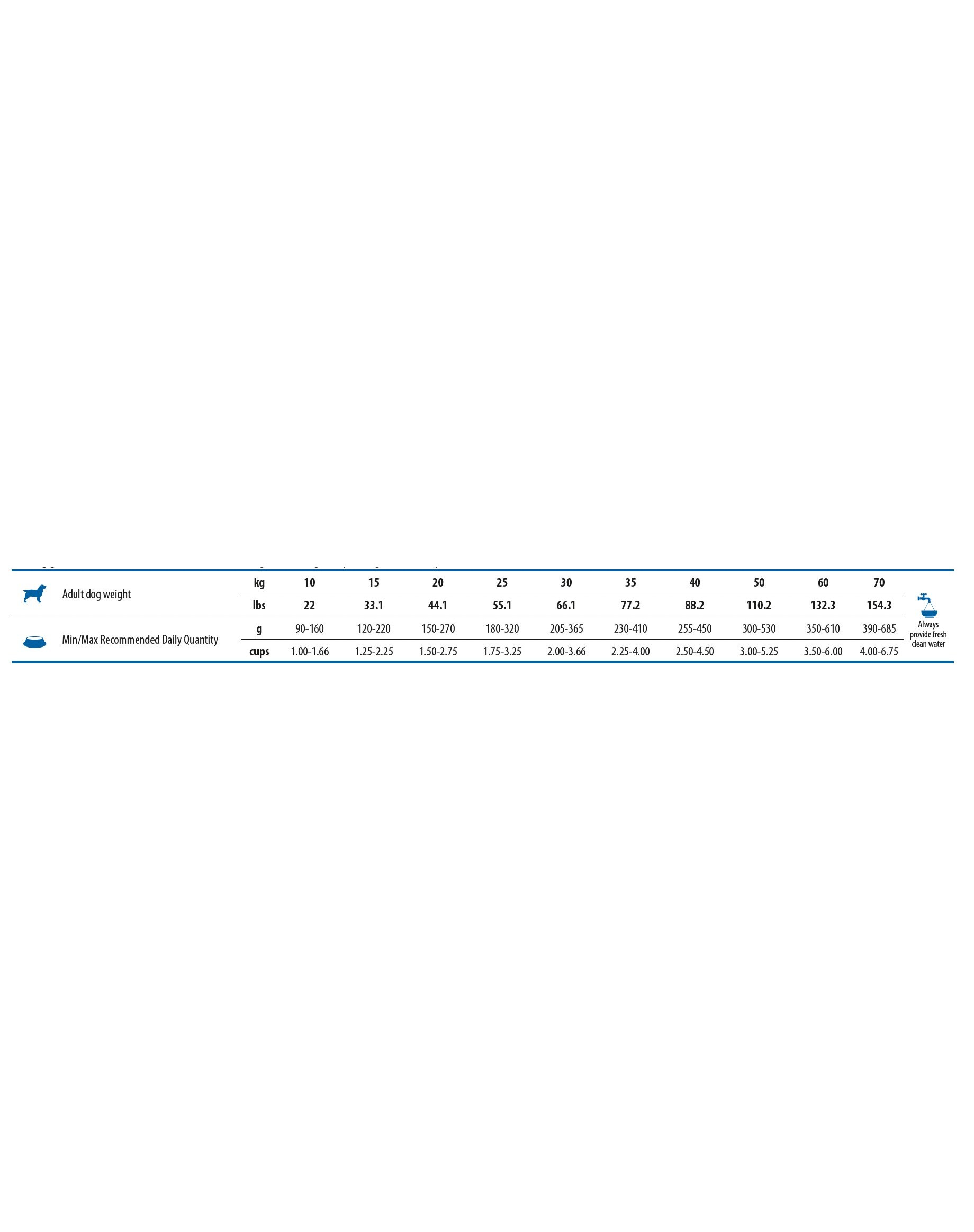 Råprotein 28,00%; råfett 18,00%; råfiber 2,90%; fukt 9,00%; råaska 8,60%; kalcium 1,10%; fosfor 0,80%; omega-6 3.30%; Omega-3 0,90%; DHA 0,50%; EPA 0,30%; Glukosamin 1200mg/kg; Kondroitinsulfat 900mg/kg.
