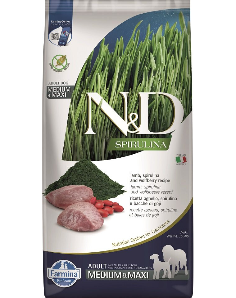 Ett helfoder för vuxna hundar av medelstora och stora raser med lamm, spirulina och gojibär.