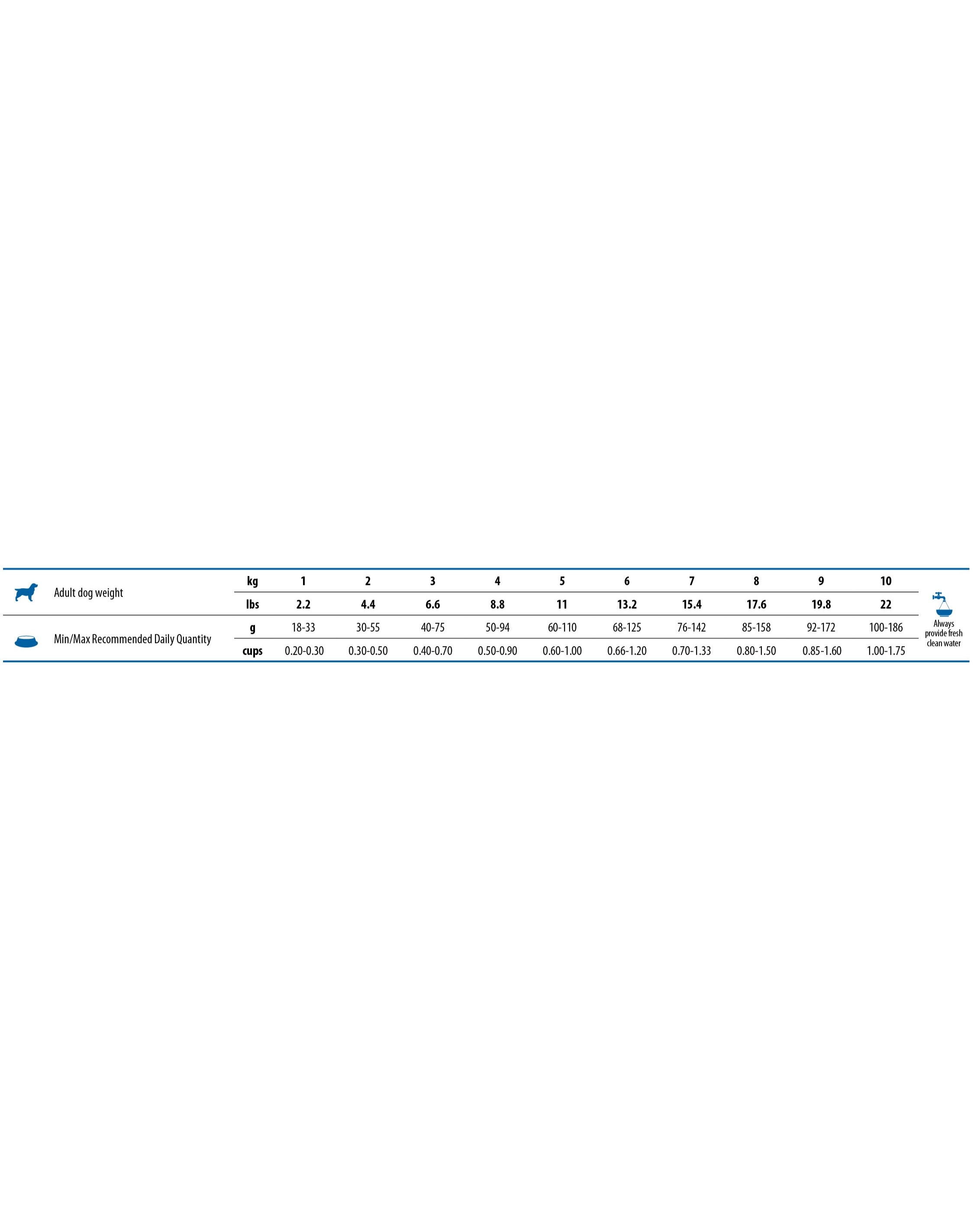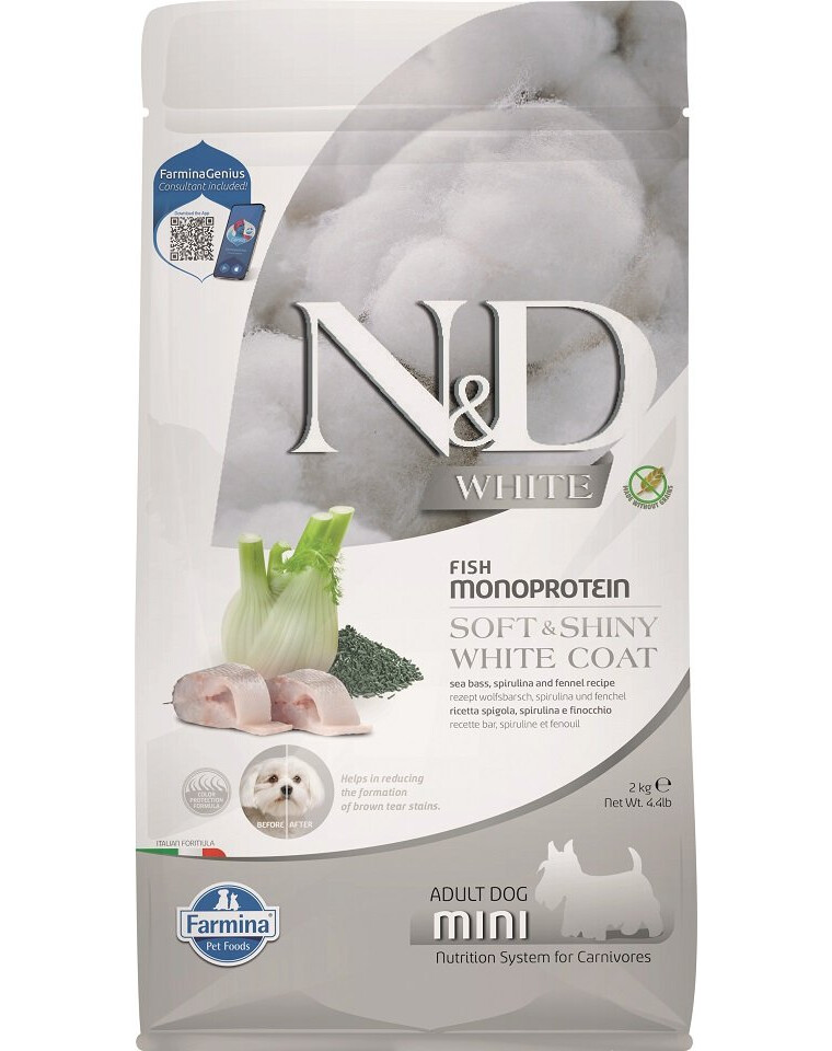 Ett helfoder för vuxna hundar av små raser med havsabborre, spirulina och fänkål.