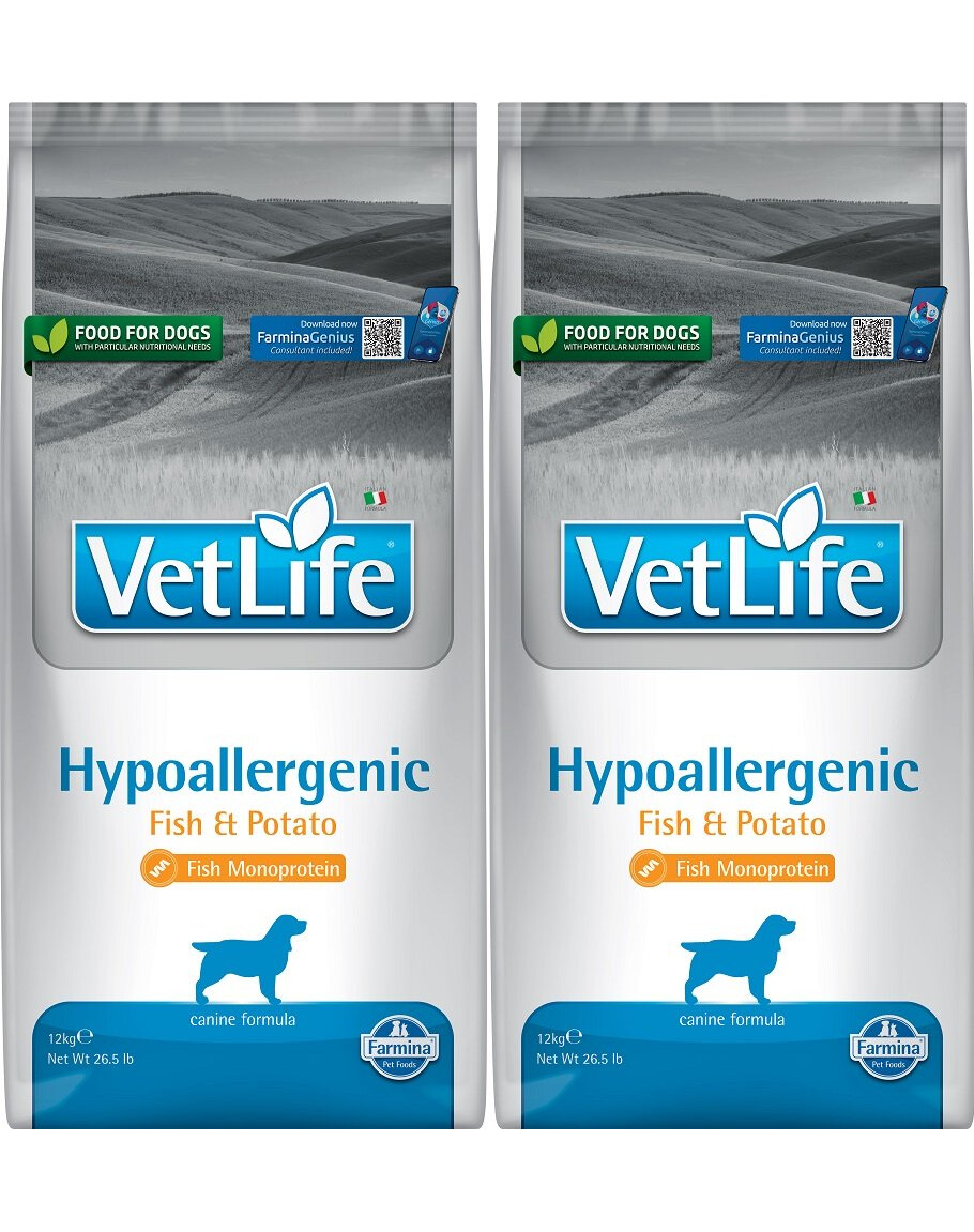 För matallergier och intoleranser. Farmina Vet Life Hypoallergenic Fish & Potato är ett dietfoder för vuxna hundar för att minska födoämnesallergier och födoämnesintoleranser