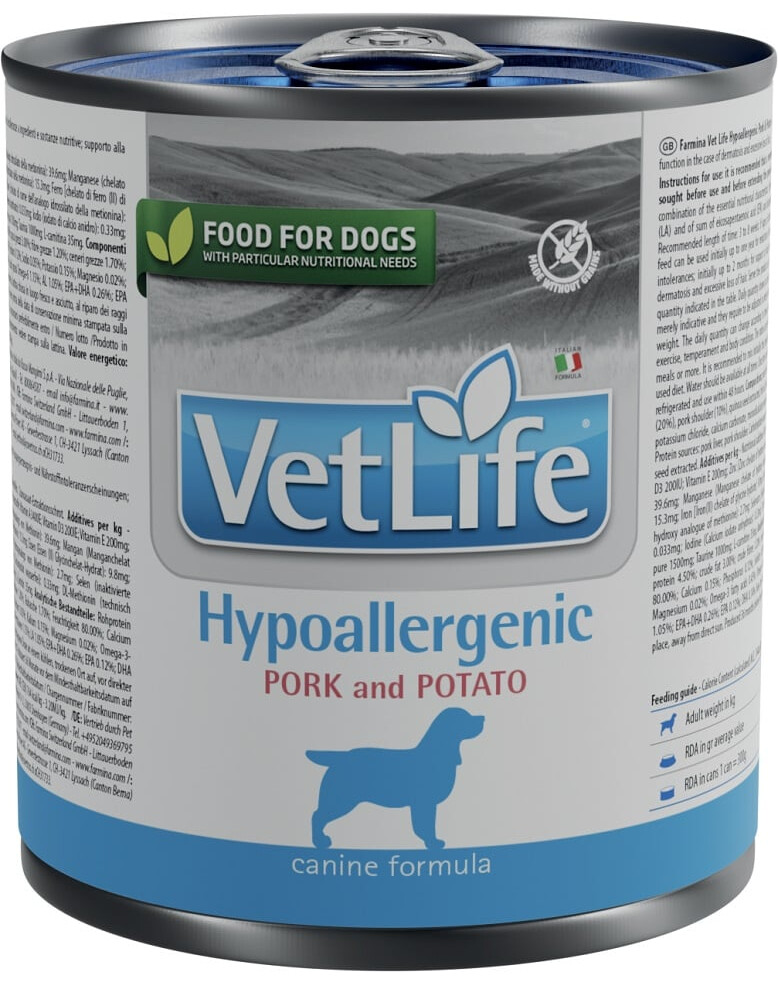 FARMINA Vet Life Natural Diet Dog Hypoallergenic Pork & Potato är en dietetisk helfoder för hundar som används för att minska intolerans mot ingredienser och näringsämnen samt stödja hudens funktion vid dermatos och håravfall.