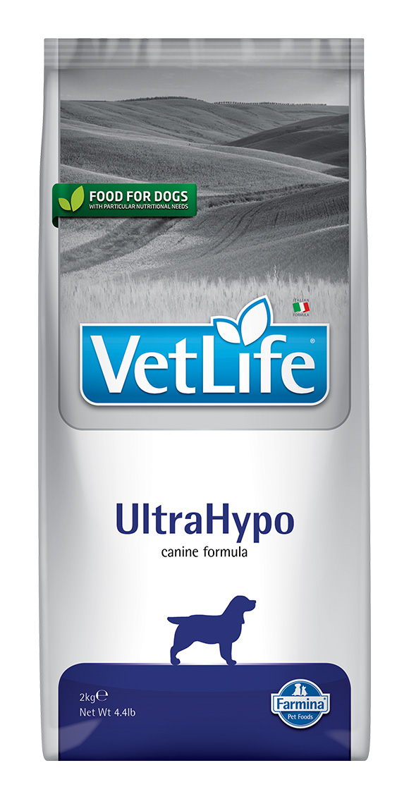 För allergiska reaktioner och atopi (ärftlig överkänslighet). Farmina Vet Life UltraHypo är ett dietfoder för vuxna hundar för att minska födoämnesallergier och födoämnesintolerans. Det används som ett diagnostiskt medel (uteslutningsdiet). Det är också särskilt lämpligt för svårbehandlad atopisk dermatit och återkommande diarré.