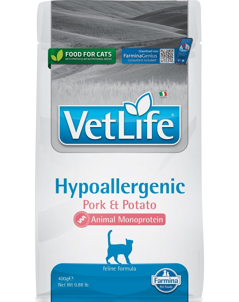 Farmina Vet Life Hypoallergenic Adult Pork är ett komplett dietfoder för katter för att minska intolerans mot ingredienser och näringsämnen; stöder hudens funktion vid dermatos och överdrivet håravfall.