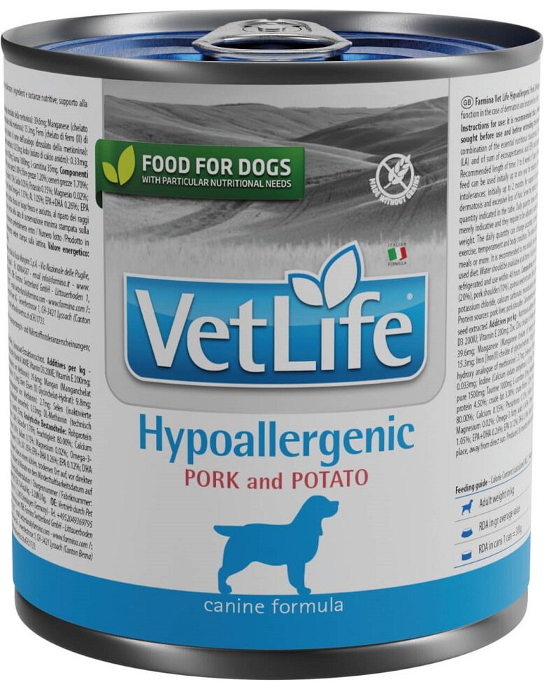 Farmina Vet Life Hypoallergenic Duck & Potato är ett komplett dietfoder för vuxna hundar som minskar näringsintolerans och stöder hud, ögon, öron och perianala körtlar.