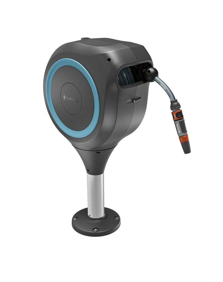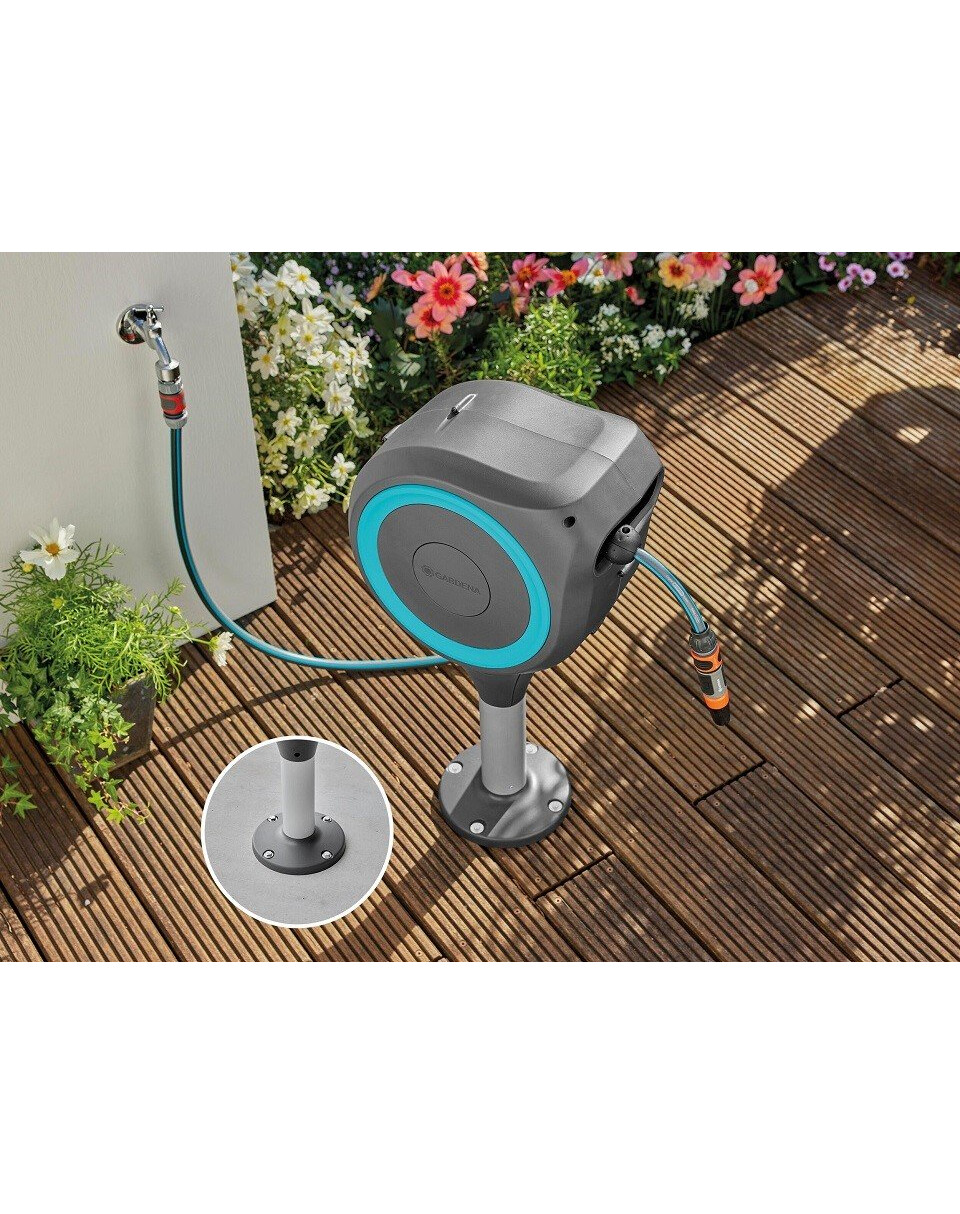 Alltid redo för bevattning: slangupprullaren RollUp S GARDENA är mer än bara en slangförvaring. Du kommer att bli förvånad över hur enkelt det är att vattna trädgården med denna välutformade rulle. Nu kan du enkelt vattna din lilla trädgård med maximal rörelsefrihet. Slangrullen är fäst vid metallskruvar och kan skruvas fast var som helst i trädgården utan att skada väggen. Använd monteringsstången för att skruva ner skruvarna i marken så att installationen blir exceptionellt stabil. Nu är det bara att dra ut slangen till en längd av 15 m och börja vattna. Den inbyggda låsningen håller slangen på den av användaren valda längden under korta intervall, vilket underlättar bevattningen. Tack vare den innovativa konstruktionen kan rullen rotera 360° för att nå varje hörn av trädgården. Rullen snurrar med rörelserna hos den som vattnar trädgården, vilket förhindrar att slangen snurrar och böjer sig. Dessutom kräver slangupprullaren inget tidskrävande rullande, böjande eller smutsande av händerna vid rullning av slangen: ett kort drag i slangen aktiverar den inbyggda fjädern, vilket möjliggör en helt automatisk och pålitlig rullning av slangen. För att förhindra att slangen snurrar och blockeras, placerar guiderna den på spolen, och rullningen kontrolleras och regleras av RollControl-teknologin. Rullarna anpassar sig till höjden på GARDENA gräsklipparen, så att du enkelt kan klippa gräset runt gräsmattan. Det högkvalitativa materialet som är UV- och frostbeständigt gör att rullen kan stå kvar i trädgården året runt. Hög hållbarhet garanteras utan ytterligare underhåll. Den kompakta och stiliga rullen är perfekt för varje trädgård. Slangupprullaren är utrustad med en flexibel anslutningsslang, alla delar och element från det originala GARDENA-systemet som krävs för installation samt en enkel spridare som producerar två typer av vattenströmmar.