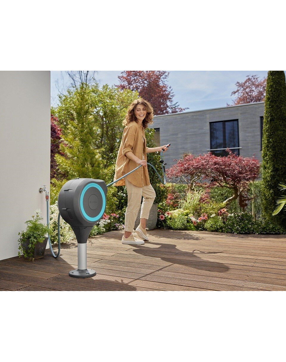 Slangupprullaren RollUp S kan placeras var som helst i trädgården och rotera 360°. Med denna slang kan du enkelt nå varje hörn av trädgården, samtidigt som du behåller maximal rörelsefrihet vid bevattning.