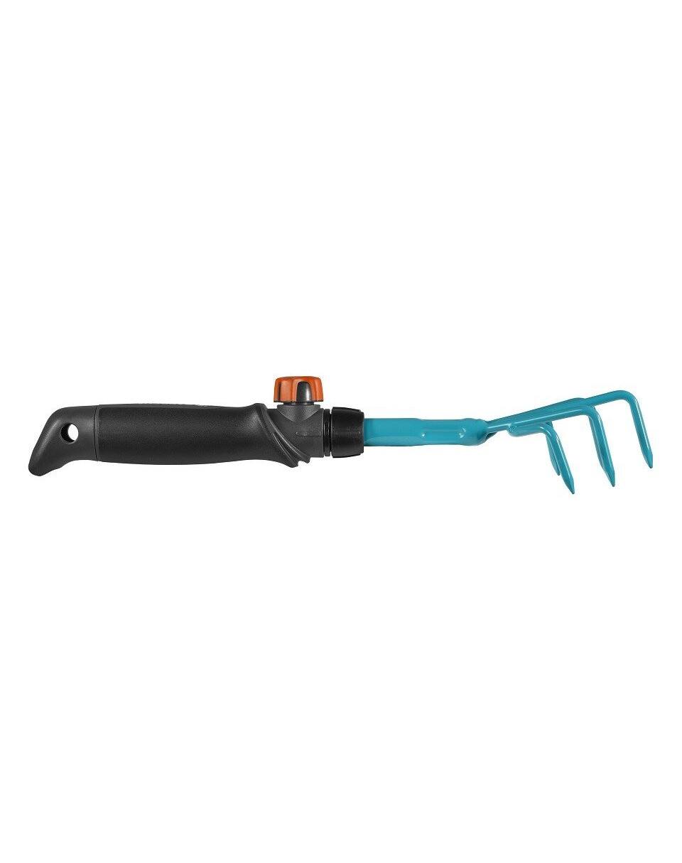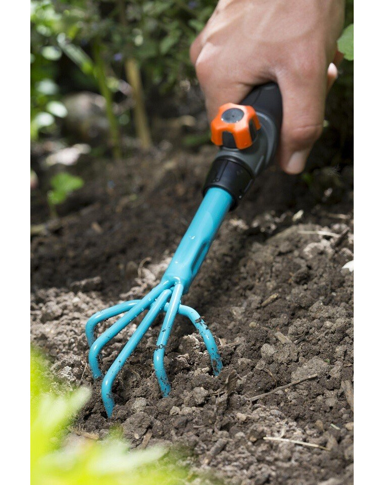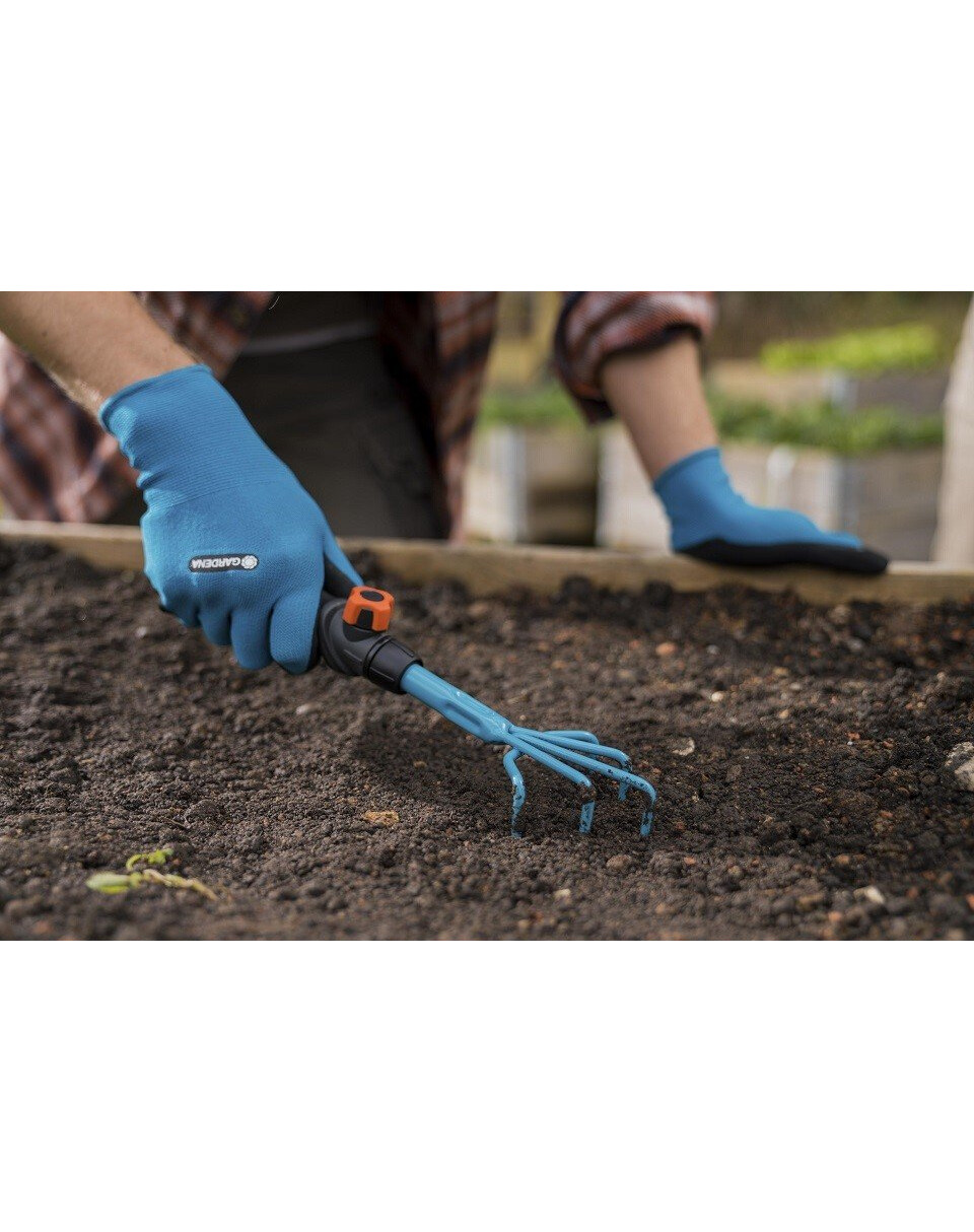 GARDENA combisystem – små klor gör det enkelt att luckra upp jorden. Tack vare de utbytbara verktygen ger GARDENA:s kombisystem flexibilitet i användningen. Den lilla klon är kompatibel med alla handtag i GARDENA:s kombisystem och kan enkelt fästas vid handtaget. För att arbeta bekvämt och utan att böja sig, behöver du bara ta bort handtaget och ersätta det med ett kombisystemhandtag. Combisystem – förlängningsskaft är perfekt för att förlänga handverktyg. Den säkra anslutningen mellan klorna och handtaget ger en bekväm arbetsupplevelse i alla situationer. Det ergonomiskt utformade handtaget med mjuka inslag passar perfekt i handen, och tack vare sina rundningar förhindrar det att verktyget glider. De små klorna med en bredd på 7 cm är tillverkade av högkvalitativt stål. Beläggningen av härdplast säkerställer hög hållbarhet för produkten. För att spara plats för förvaring av klorna kan du använda combisystem – verktygshängare Flex.
