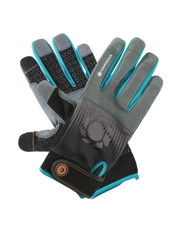 GARDENA har också rätt skyddskläder för krävande arbete med trädgårdsredskap med verktygshandsken i storlek XL. Handflatan på handsken för trädgårdsredskap är silikonbelagd, vilket innebär att verktyg och utrustning inte bara ligger säkert i handen utan inte heller kan glida av. Den vadderade handflatan gör det också lättare att greppa. Detta minskar också stötar avsevärt, t.ex. vid vedhuggning. Det är också viktigt att en arbetshandske har bra passform. Brukshandsken för mycket stora händer uppfyller detta krav tack vare det praktiska fästet vid handleden och det flexibla materialet på manschetten och handryggen, vilket ger en perfekt passform. Den andas också tack vare det använda mesh-materialet och mikrofleecen på tumvecket med svettabsorbering, så att du inte blir svettig. Om du vill använda din smartphone under en rast behöver du inte ta av dig handsken. Tack vare den mobila touchfunktionen är fingertopparna på tummen och pekfingret lämpliga för att använda en smart enhet. Alla textilier i den smartphone-kompatibla och exakt passande handsken är fria från skadliga ämnen, vilket bekräftas av certifieringen Oeko-Tex® Standard 100.