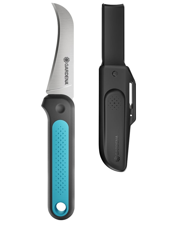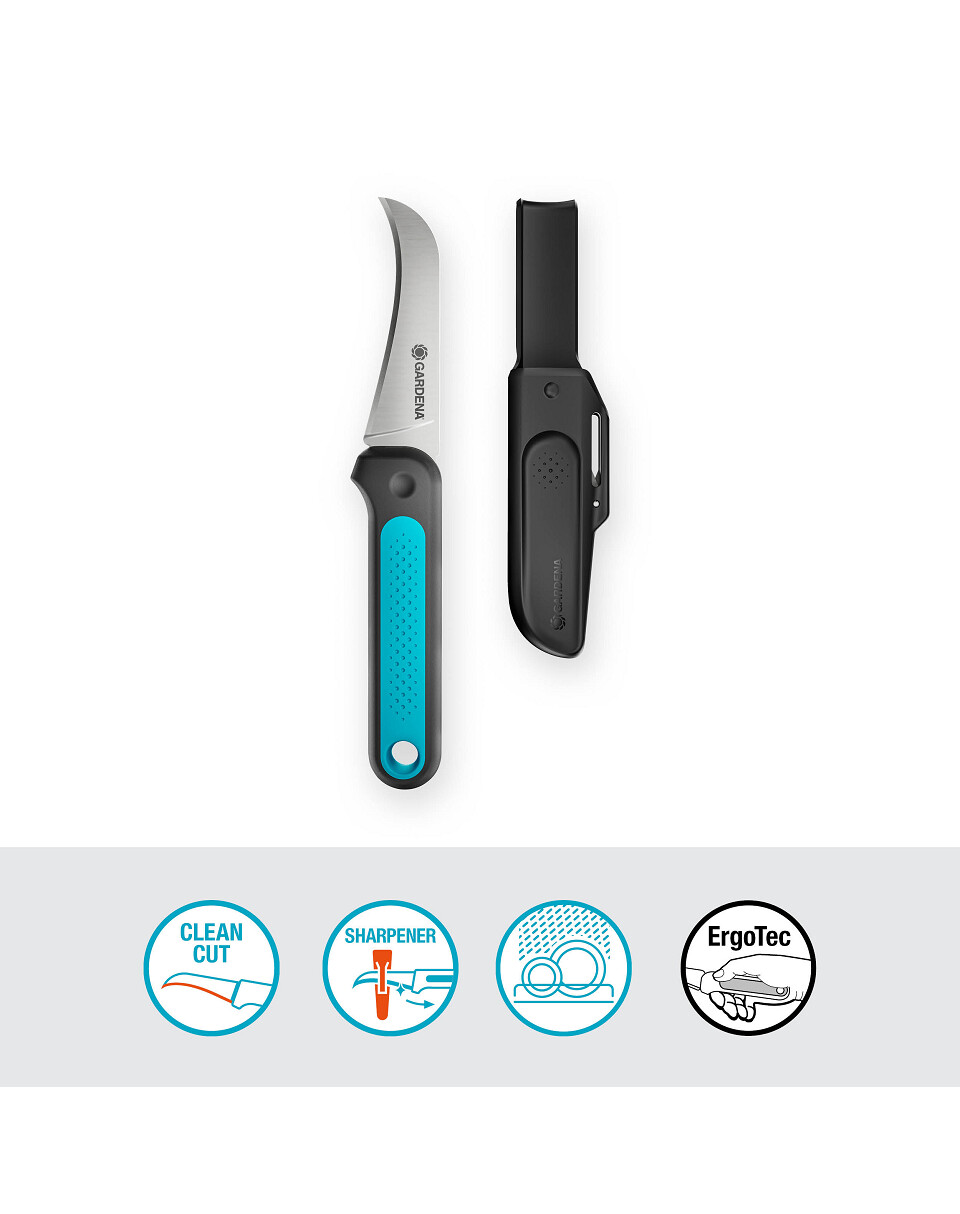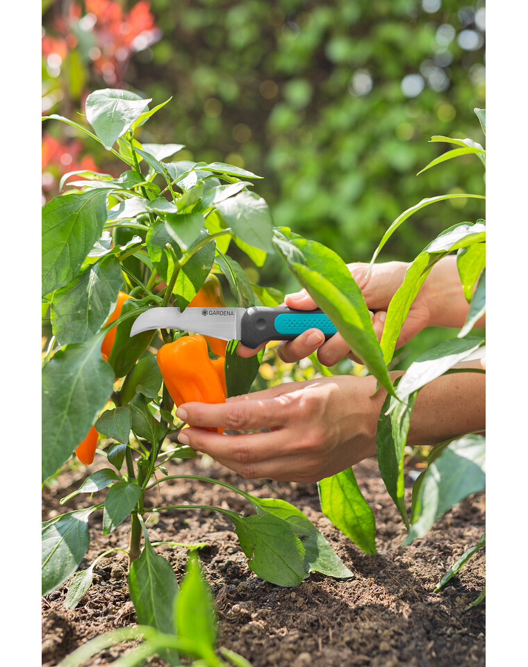 Den praktiska kökssaxen och grönsakskniven VeggieCut från GARDENA är avsedd för att plocka, rengöra och skala grönsaker. Den hållbara kniven i halvmåneform är tillverkad av rostfritt stål. Den ger precisa, rena och enkla snitt. Även tjockare grönsaker, som zucchini, kan skäras med ett enda snitt. Den i Tyskland utvecklade kniven är alltid nära till hands under skörden tack vare det bältesfodral som säkerställer säker förvaring. Vid behov kan den integrerade sliparen användas för att slipa kniven. Det ergonomiska handtaget ErgoTec ligger bra i handen, och de inbyggda mjuka elementen förhindrar att kniven glider ur handen. VeggieCut-knivarna är designade för att komma i kontakt med livsmedel utan att påverka deras smak och doft. Med hjälp av krokar kan den hängas på väggen i köket, vilket underlättar förvaringen. Denna kökssax och grönsakskniv kan diskas i diskmaskin, vilket gör den lätt att rengöra.
