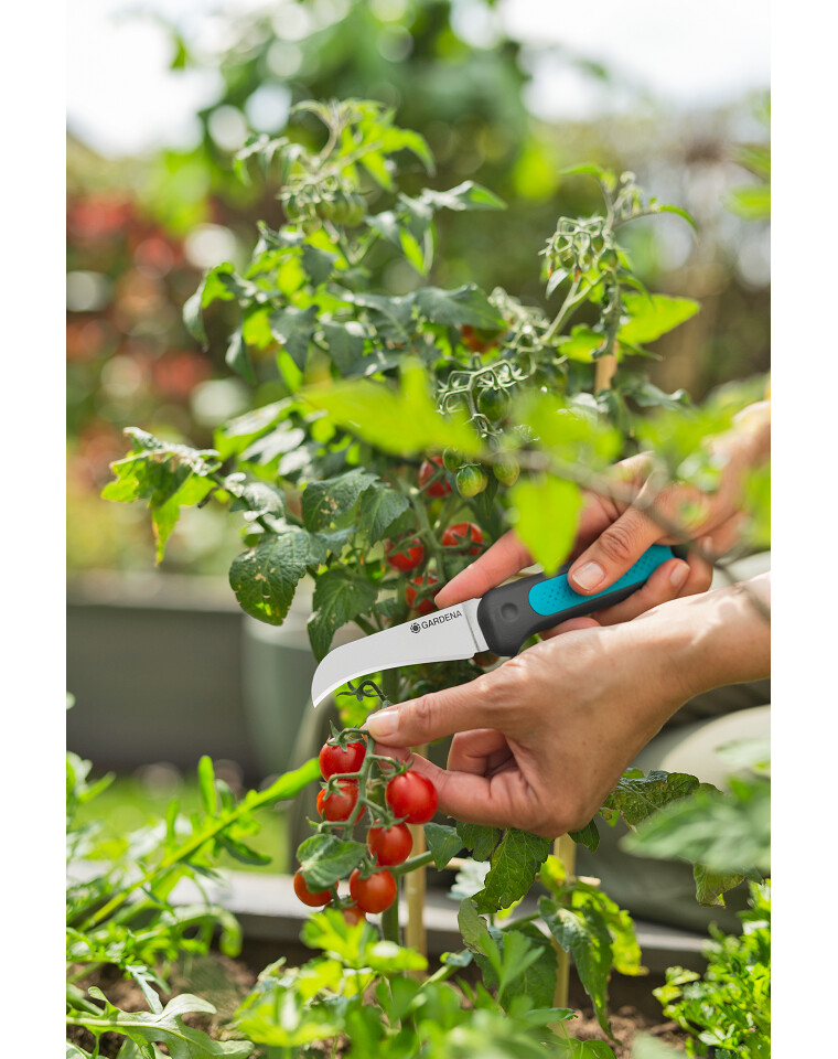 Den halvmåneformade skärkniven VeggieCut är perfekt för att plocka grönsaker. Det hållbara bladet av rostfritt stål ger ett enkelt, precist och rent snitt redan vid första försöket.