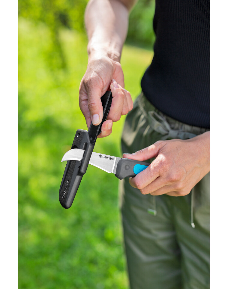 Fodralet för säker förvaring av kniven gör det enkelt att fästa VeggieCut på bältet så att kniven alltid är nära till hands. Tack vare den integrerade sliparen kan kniven slipas vid behov.