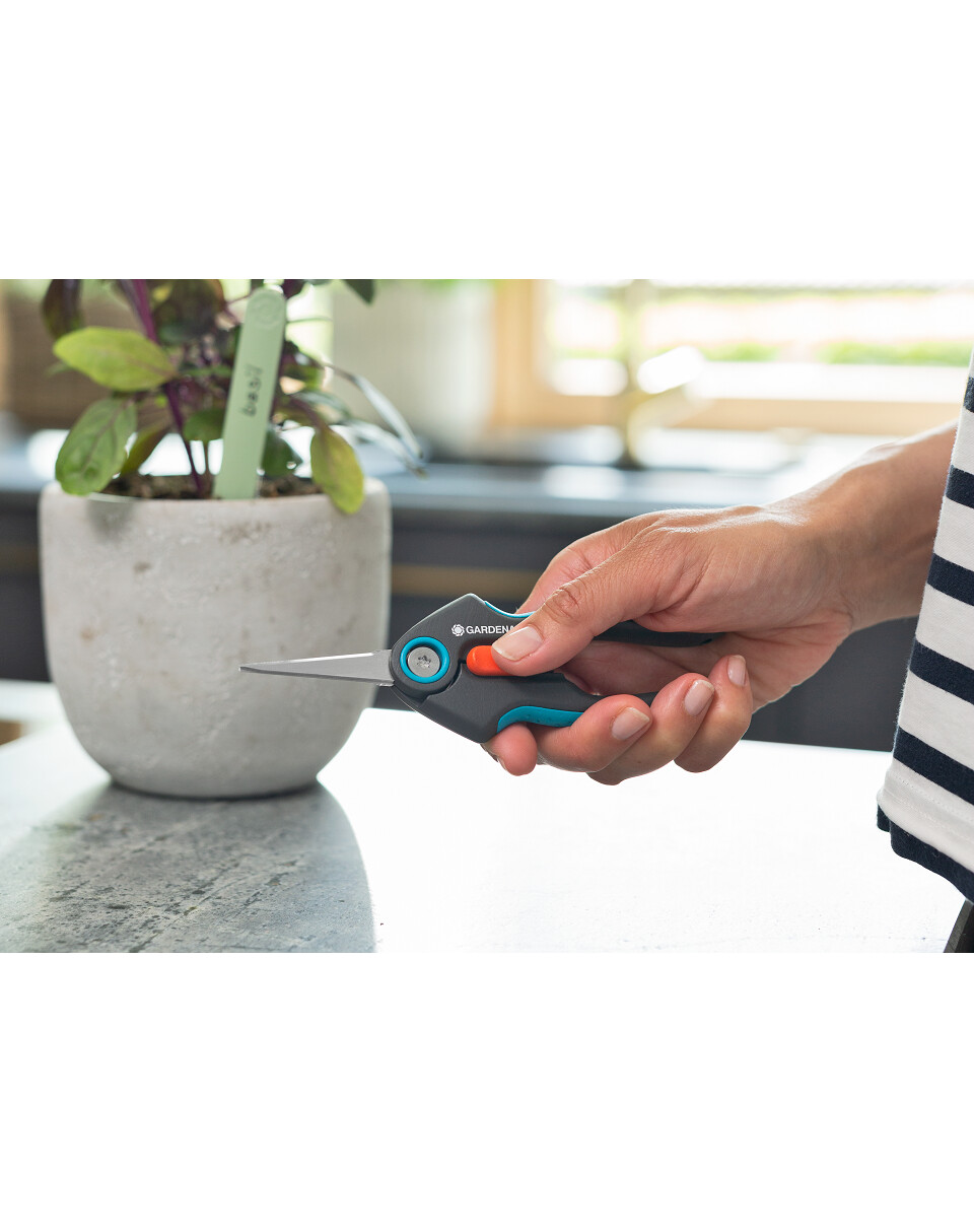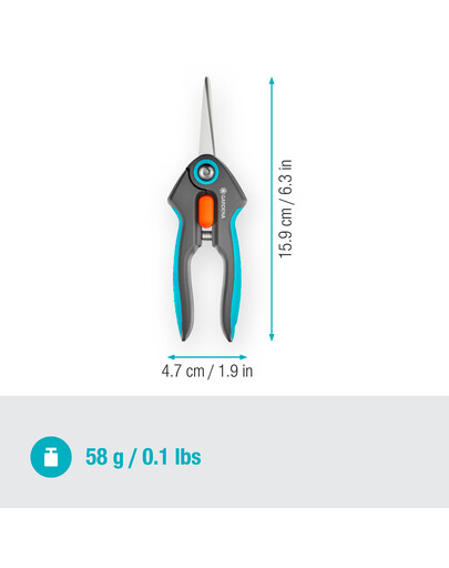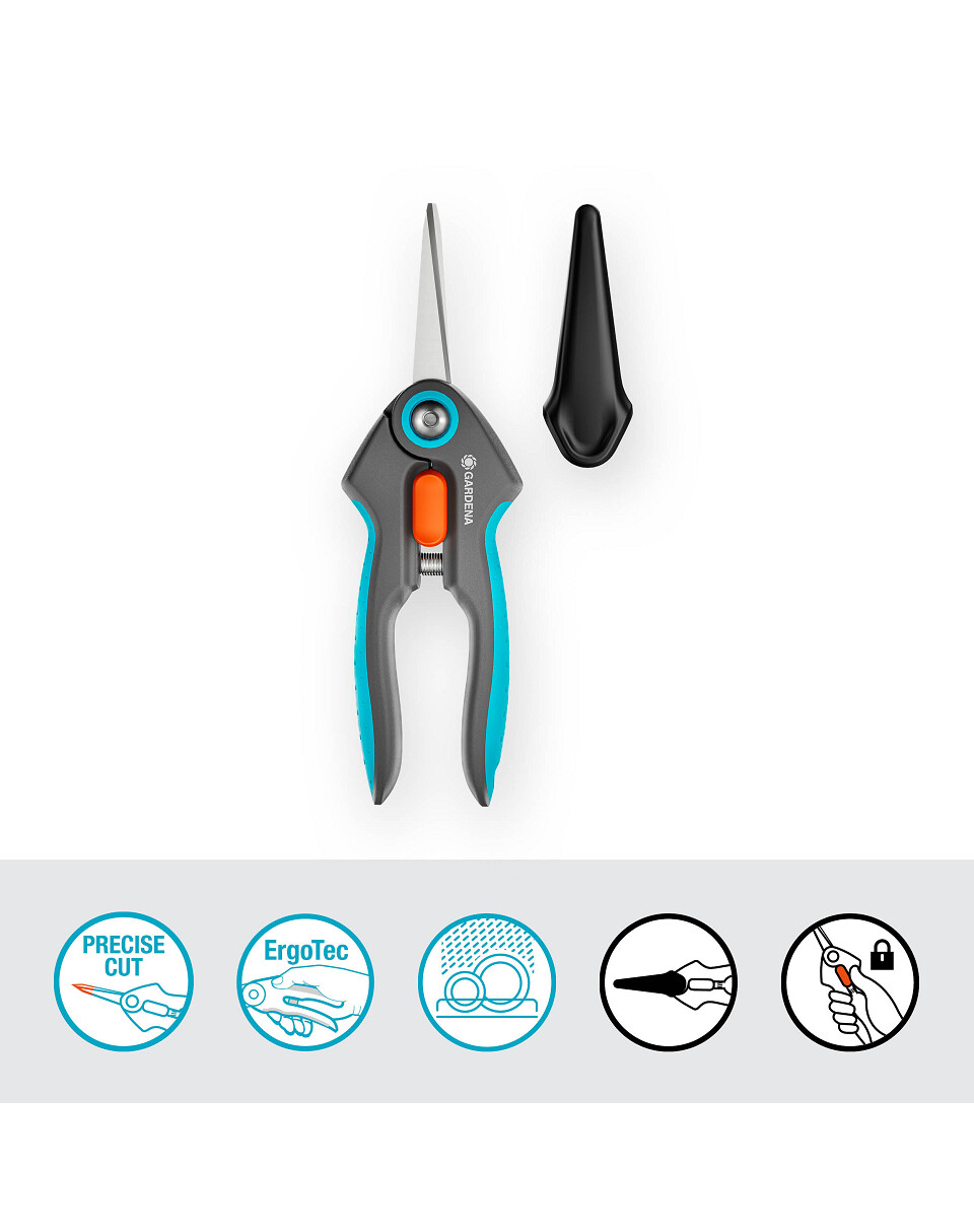 GARDENA FreshCut-saxar är perfekta för att plocka färska örter och bär, samt för att klippa blommor. Det smala, vassa bladet är tillverkat av korrosionsbeständigt och hållbart stål och imponerar med varje klipp. FreshCut klipper rent och precist ända till spetsen. Saxarna för örter och grönsaker fungerar också bra i små utrymmen, vilket gör att du enkelt kan plocka basilika eller vissna blommor. De ligger bekvämt och säkert i handen tack vare det ergonomiska, halkfria handtaget ErgoTec och det mjuka greppet. För att säkerställa säker förvaring och transport, sätt på det medföljande skyddshöljet på de medföljande saxarna. Låsmekanismen som kan hanteras med en hand gör det enkelt att låsa och låsa upp saxarna. Oavsett vilken typ av växt som klipps påverkar inte de livsmedelsgodkända bladen dess smak och doft. För att underlätta rengöring kan saxarna diskas i diskmaskin.